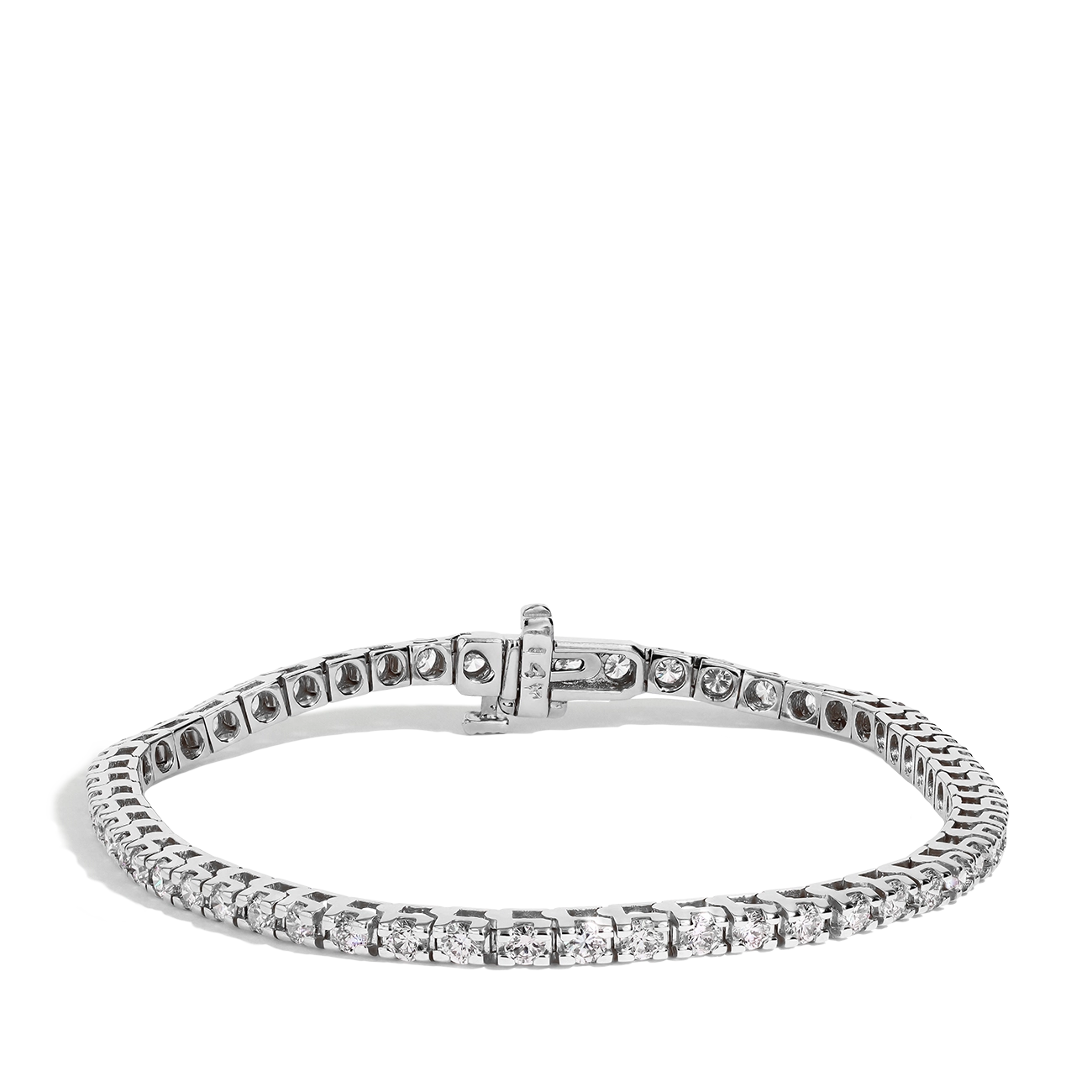 This diamond tennis bracelet is crafted in 14K white gold and set with beautiful round brilliant cut diamonds of G-H color and SI1-SI2 clarity, weighing a total of 3.00ctw. The bracelet features a push clasp with a safety latch underneath.