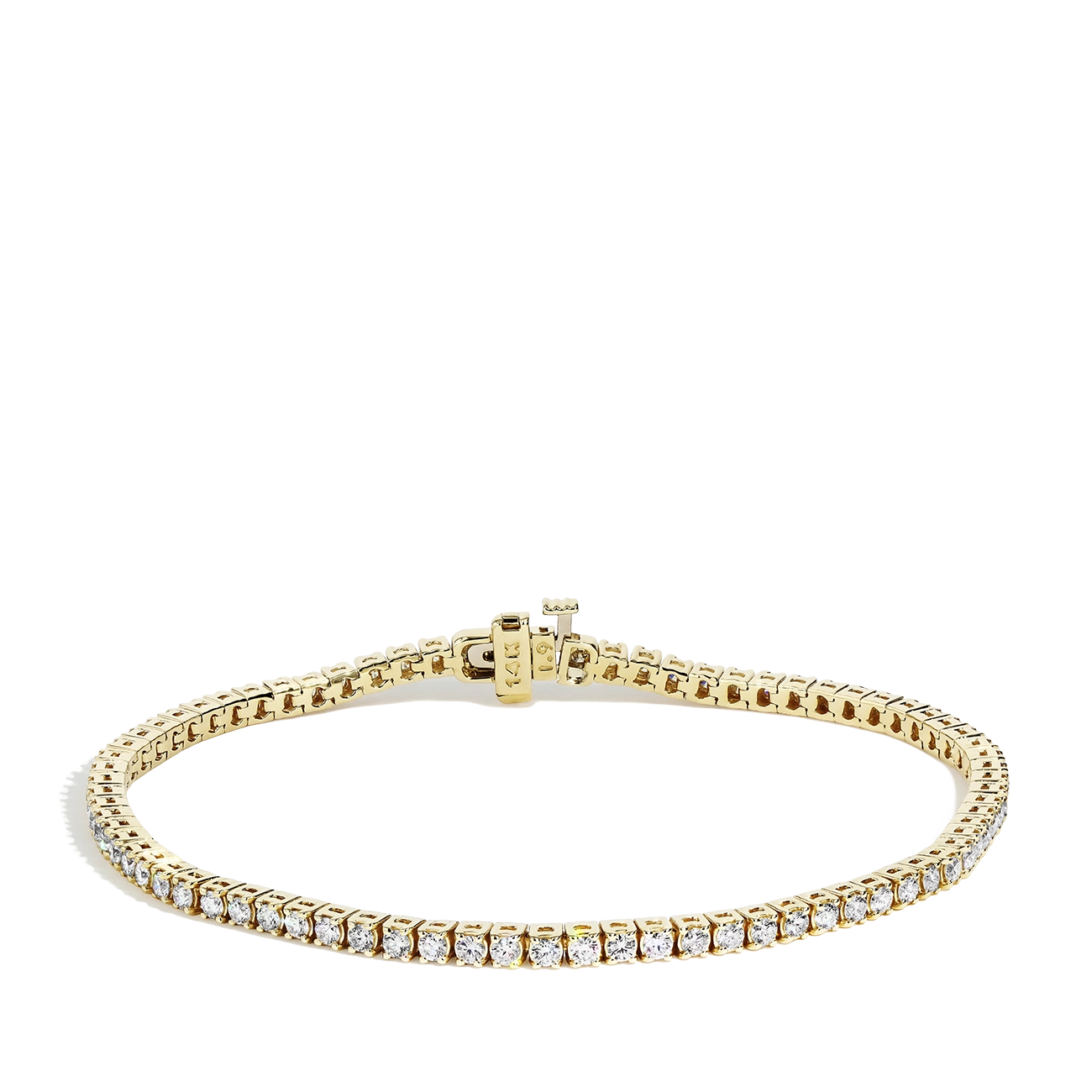 This diamond tennis bracelet is crafted in 14K yellow gold and set with beautiful round brilliant cut diamonds weighing 2.00 ctw. The bracelet features a push clasp with a safety latch underneath.