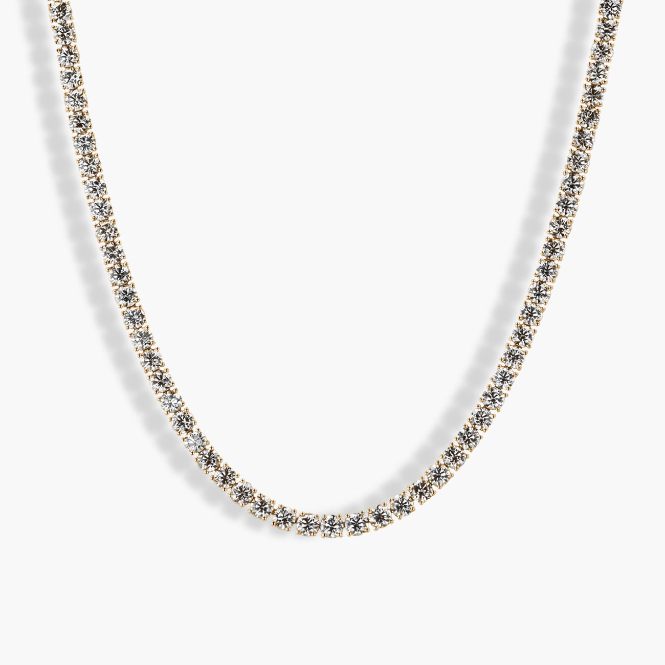 This exquisite diamond tennis necklace, crafted in 14K yellow gold, showcases round brilliant-cut diamonds with a total weight of approximately 21.40 carats. Designed for both elegance and security, it features an 17-inch length that sits beautifully on the neckline. A timeless piece, this necklace is the perfect addition to any jewelry collection—wear it solo for a sophisticated statement or layer it with other necklaces for a chic, stacked look.