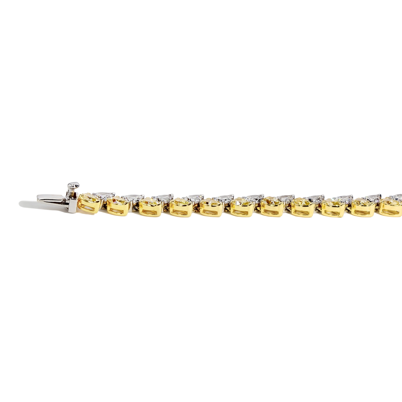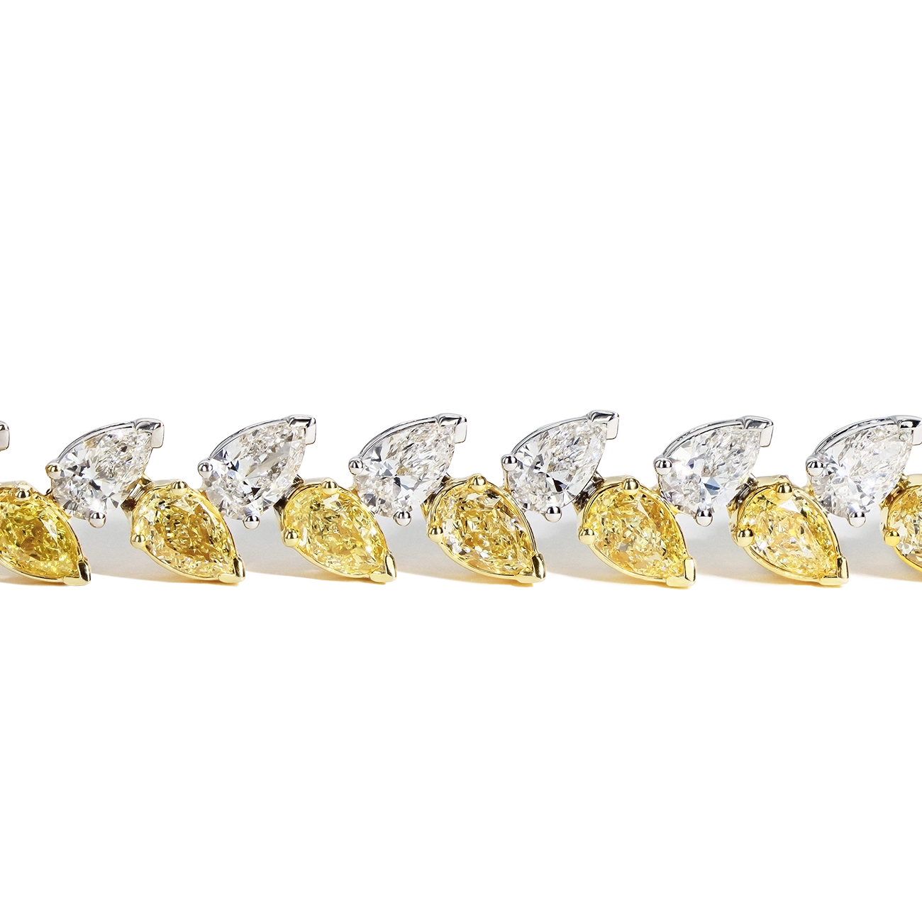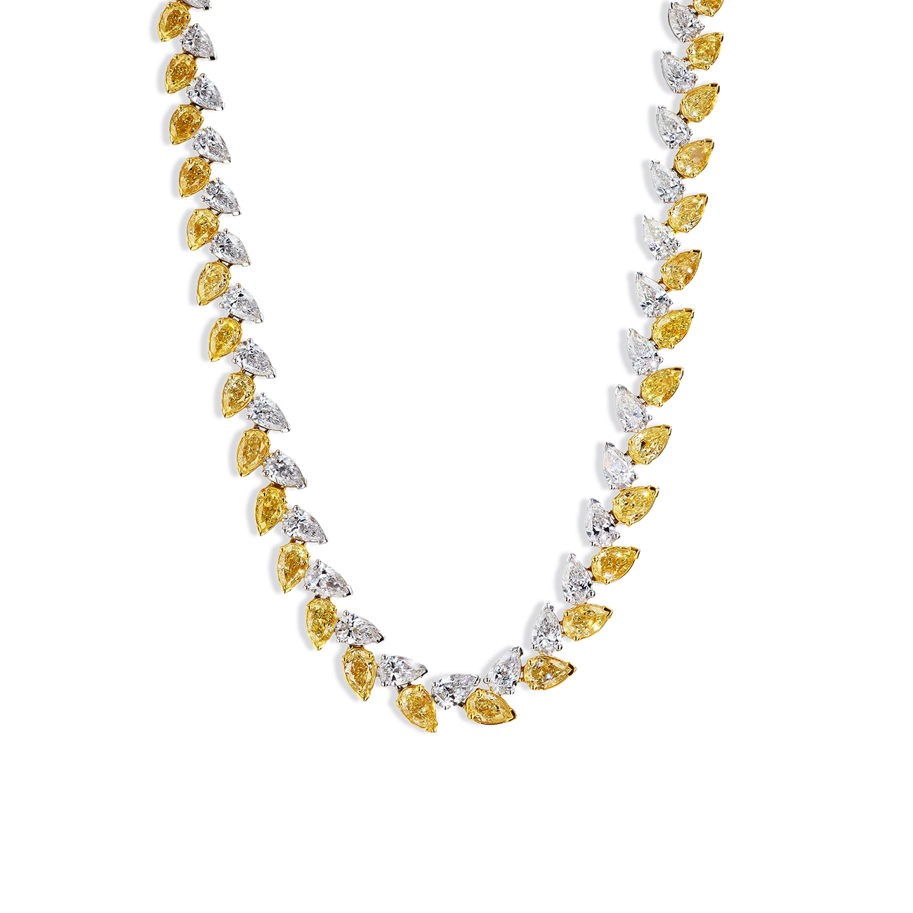 This exquisite 17-inch necklace showcases a stunning arrangement of 65 fancy yellow pear-shaped diamonds and 64 white pear-shaped diamonds, totaling 30.92 carats. Set in 18K yellow and white gold, each diamond is perfectly positioned in an alternating pattern, creating a seamless flow of color and contrast. This is an extraordinary statement piece for any elegant occasion.