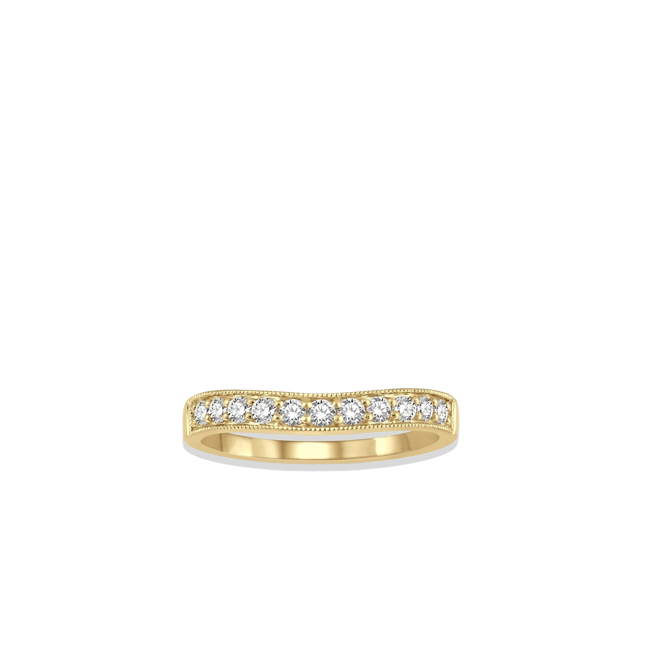This 14K yellow gold wedding band features eleven round diamonds totaling .33 carat set in shared prongs. A delicate milgrain detail frames the edges, adding subtle texture to the design. The gently curved band measures 1.8 millimeters in width, allowing it to sit comfortably alongside an engagement ring. With its clean silhouette and balanced sparkle, this band is a timeless choice for stacking or wearing on its own.