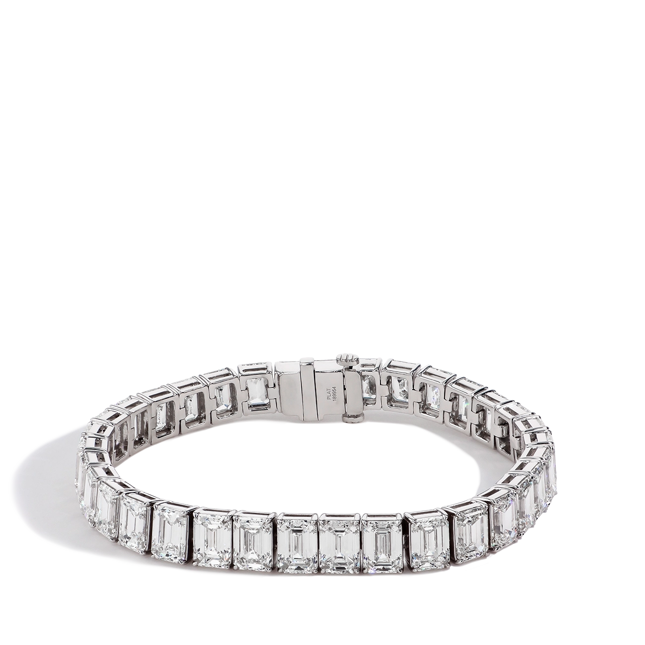 This breathtaking platinum tennis bracelet features 34.77 carats of emerald-cut diamonds in G–H color and VS clarity. Each diamond is meticulously set in a flexible design that drapes elegantly around the wrist, offering both brilliance and comfort. A timeless statement of luxury, this bracelet embodies precision craftsmanship and enduring sophistication.