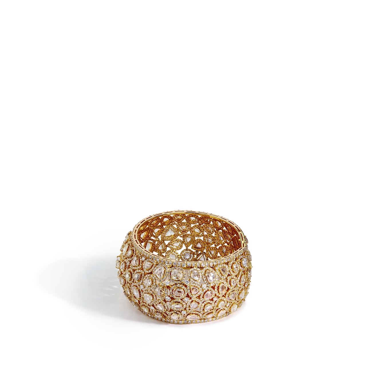 Crafted in rich 18K yellow gold, this exquisite bangle is set with 38.10 carats of rose-cut diamonds. Its openwork lattice design creates a bold yet airy look, while the mix of pear and round shapes add brilliance from every angle. A true statement piece, this bangle balances elegance with modern sophistication.