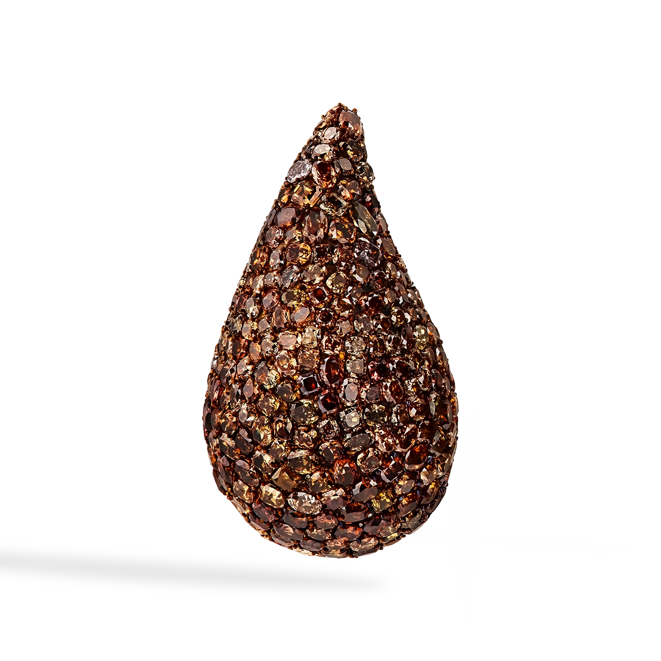 These dramatic teardrop earrings showcase 56.14 carats of pavé-set brown diamonds, creating a bold and captivating look. Their rich color and striking silhouette make them a true statement piece for special occasions.