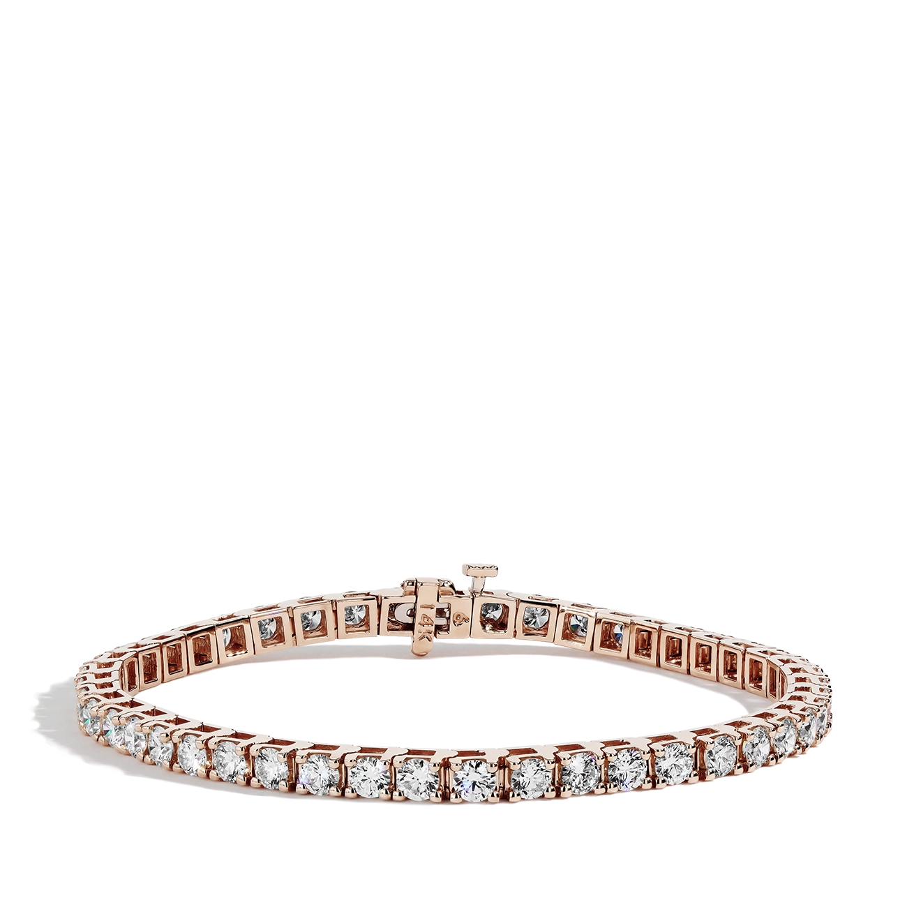 14K rose gold tennis bracelet showcasing 6cttw of round brilliant cut diamonds in four prong settings. Designed with a pressure clasp and a safety latch underneath. Near colorless diamonds with eye clean clarity.
