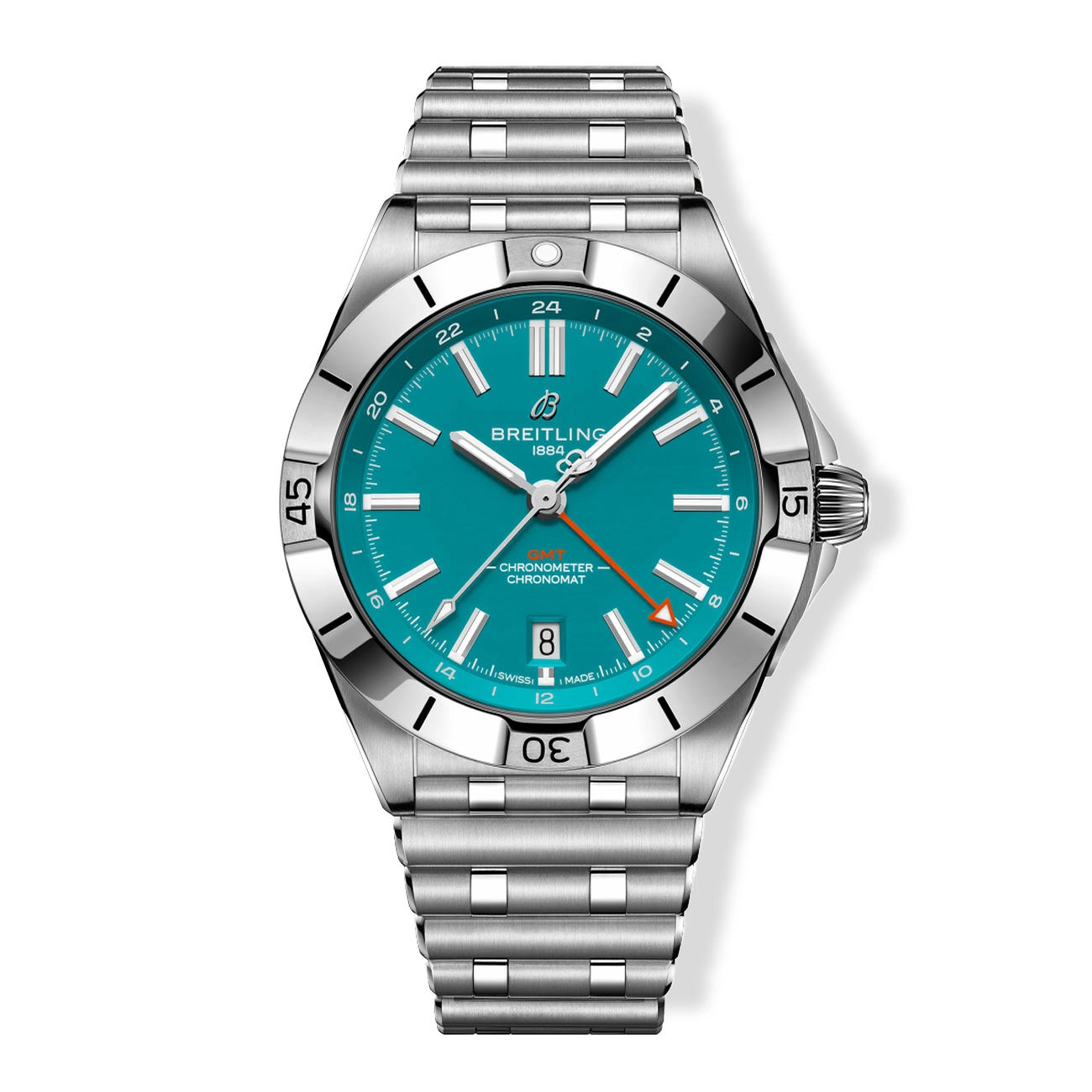 Celebrate the spirit of the Dolphins with the Breitling Chronomat Automatic GMT 40 Miami Dolphins, a sleek and versatile timepiece designed for fans who live and travel with their team. This collector’s watch features a 40 mm stainless steel case, a striking turquoise dial with silver accents, and a polished caseback engraved with the team emblem. Equipped with the Breitling Caliber 32 movement, it offers dual-time functionality, making it perfect for game days at home or away. Water-resistant to 200 meters and fitted with a stainless steel Rouleaux bracelet and butterfly clasp, this watch combines durability, performance, and Dolphin pride.