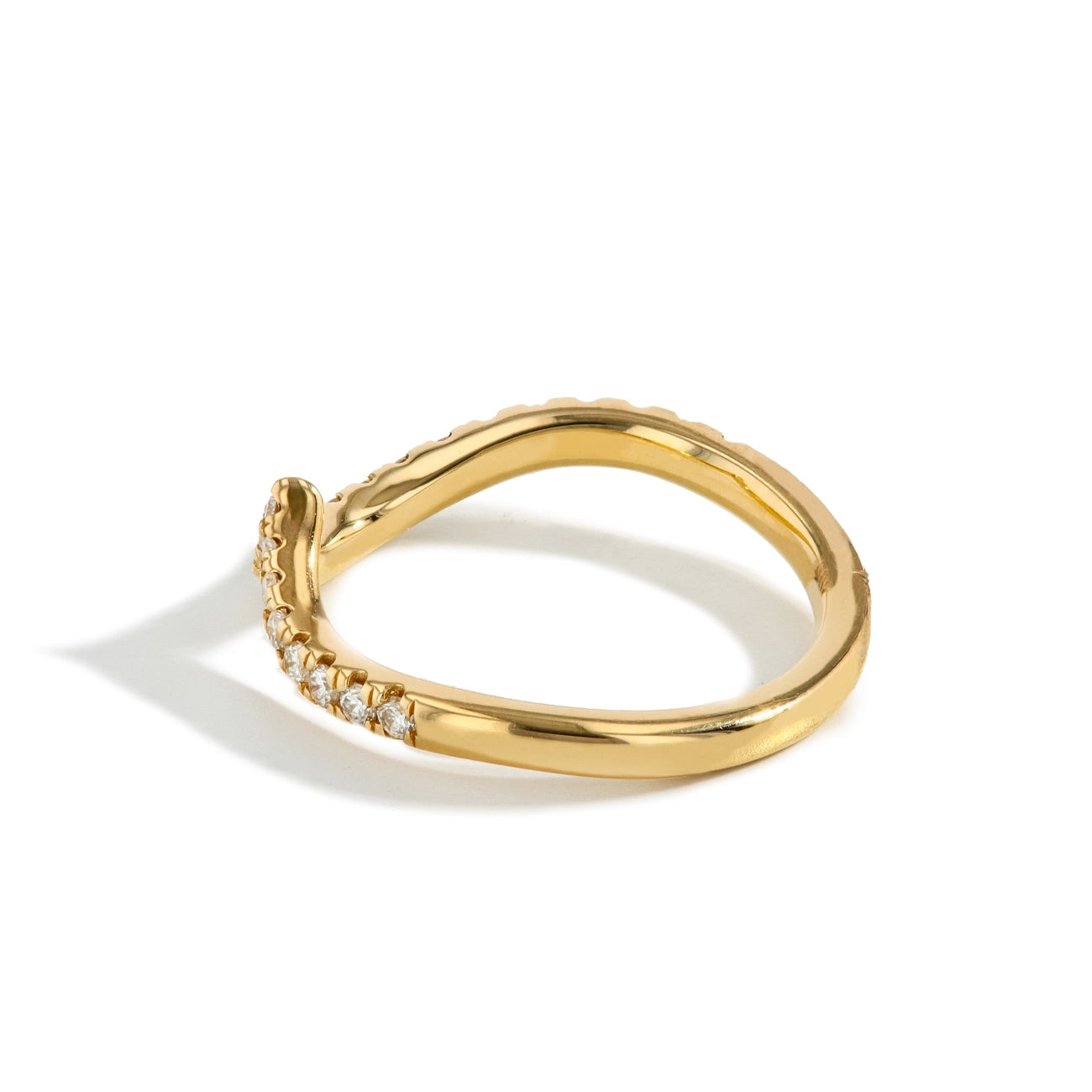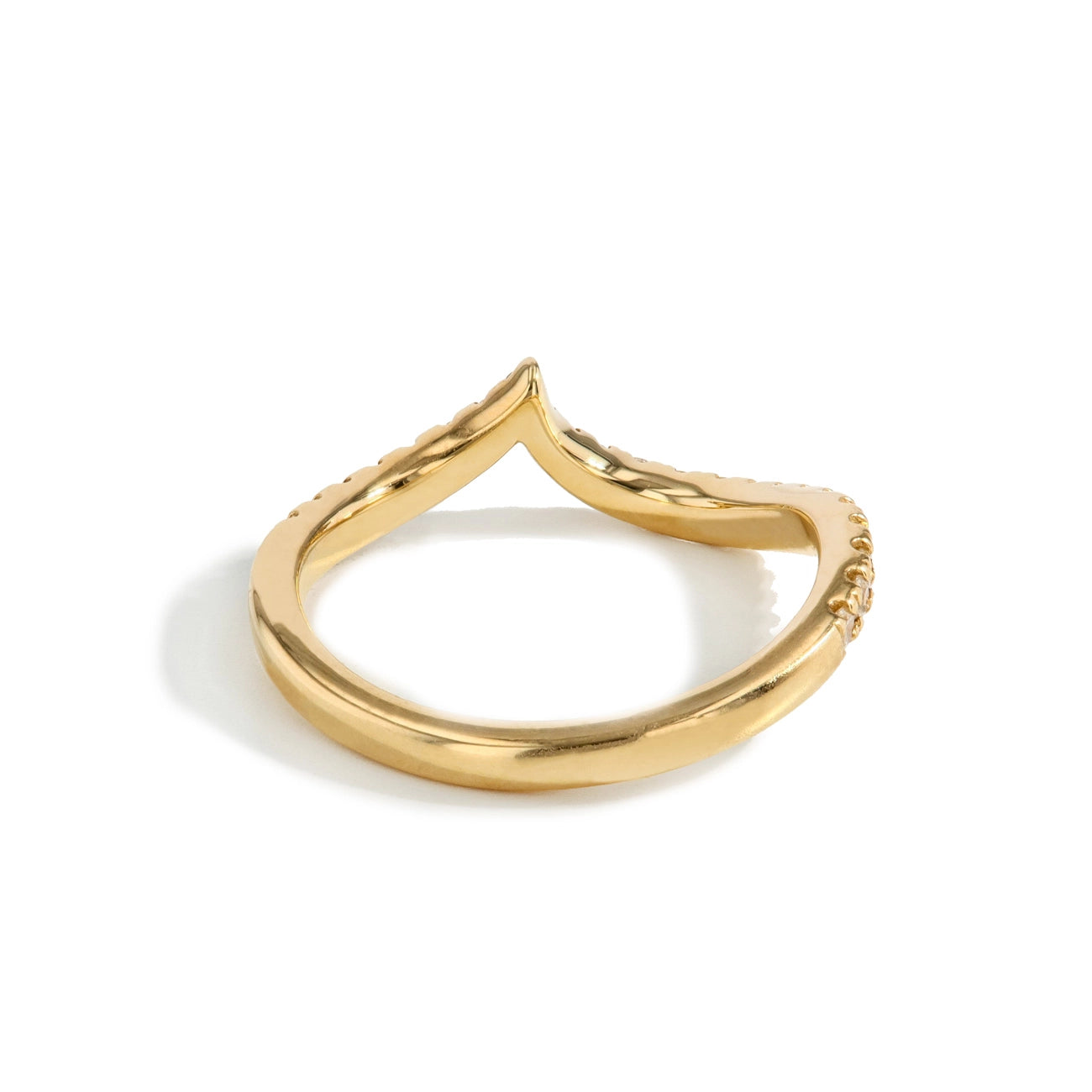 This curved wedding band is crafted in 14k yellow gold and set with .29 carats of diamonds along the front, adding brilliance and sparkle. Its contoured design is made to nest seamlessly with an engagement ring, making it the perfect complement to a curved oval solitaire. Elegant and versatile, it shines both on its own and as part of a bridal set.