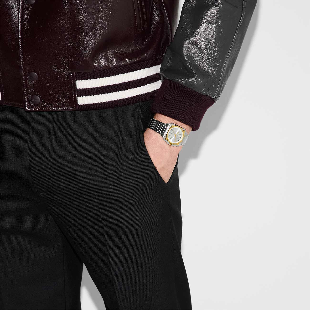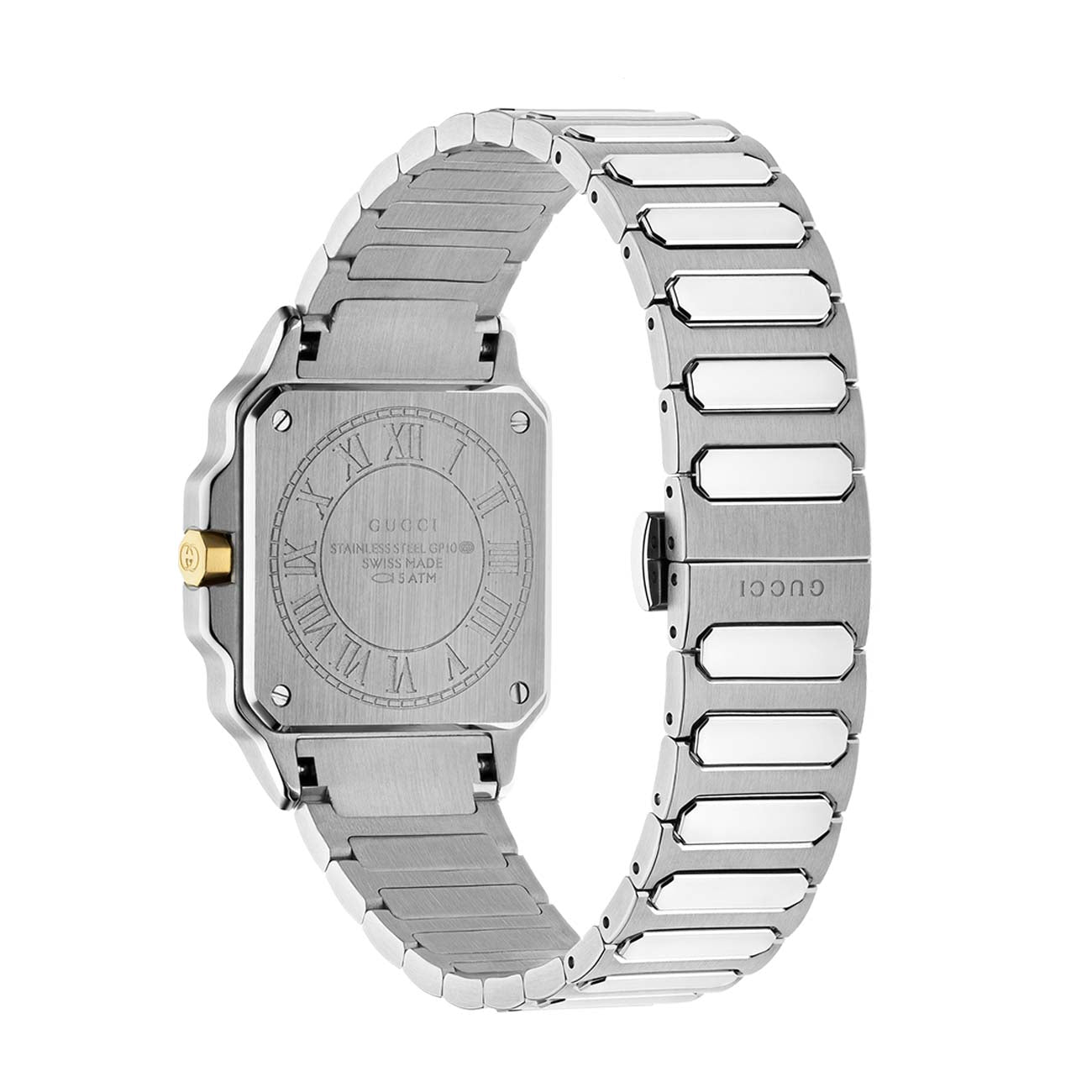 Originally introduced in the 1970s, the G-Flat watch reinterprets the House’s heritage designs with a contemporary edge. Featuring bold octagonal angles and a multi-layered profile, it captures the architectural essence of the era. This timepiece is crafted in stainless steel, showcasing a silver galvanized dial with Roman indexes for a refined, timeless appeal.