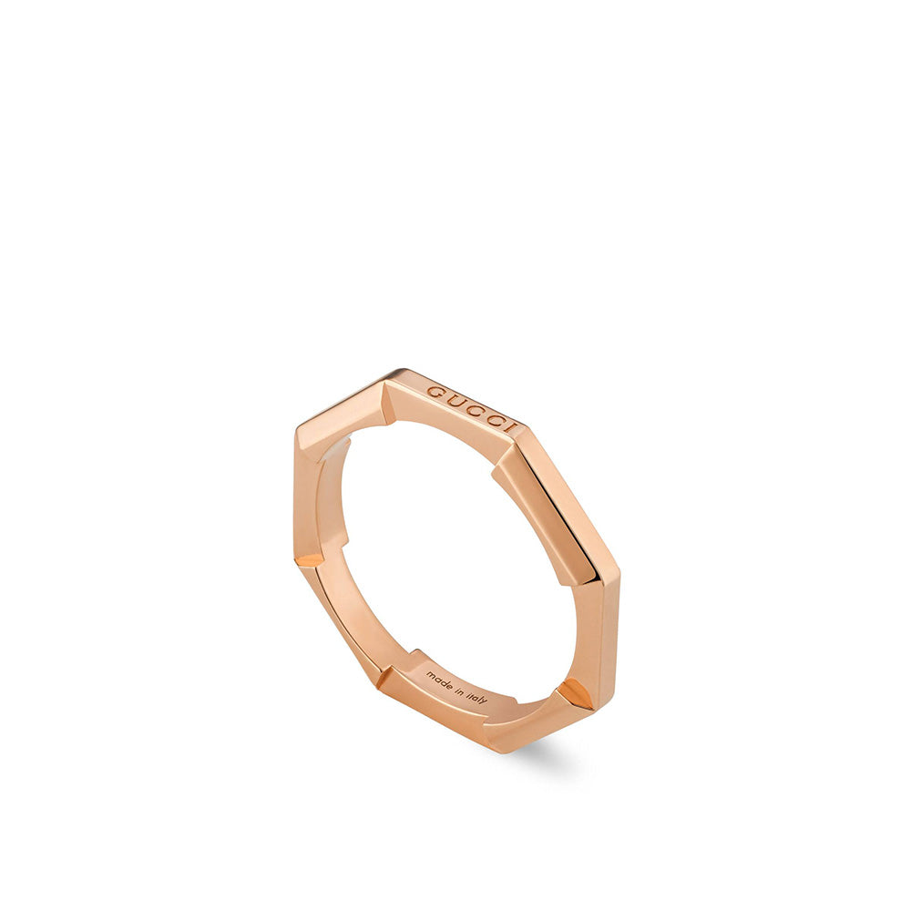 The Link to Love collection from Gucci explores modern romance and characterizes new symbols of love. This 18k rose gold mirrored ring features "Gucci" engraved on the ring. Wear this with other stackable or layered jewelry for a unique and individualized look!