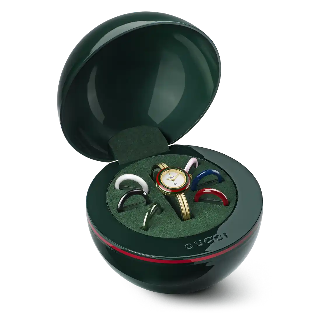 The iconic classic is back with the new Gucci Play watch featuring a 28mm sleek silhouette and 7 colored interchangeable ceramic bezels. This watch is powered by a quartz movement. The white dial features the house emblem and a single hour marker at 12.
