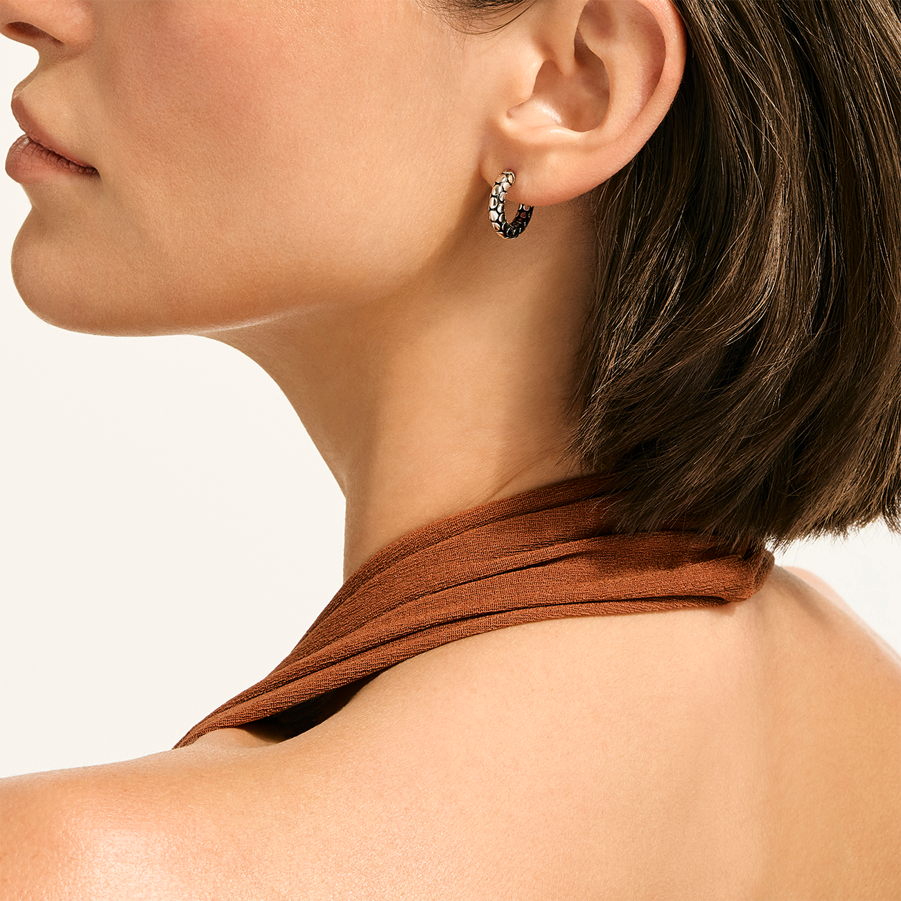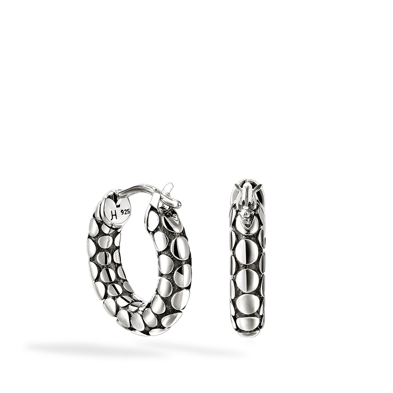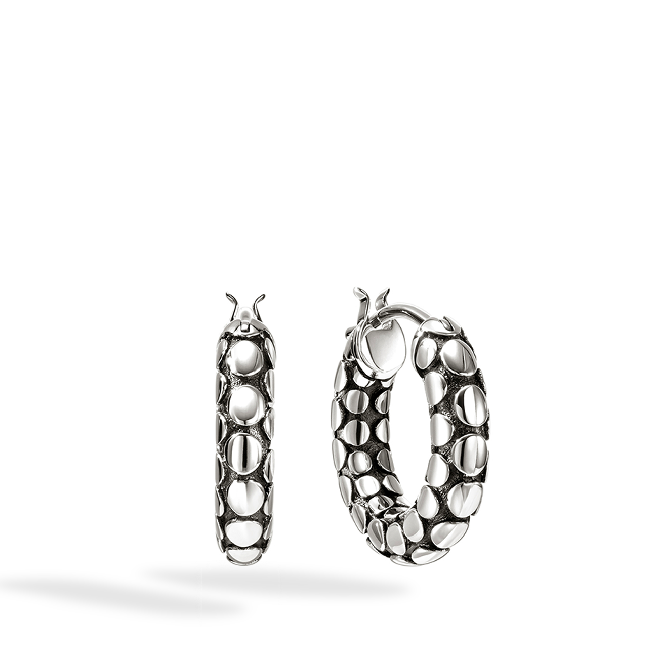Made from sterling silver, these 15mm hoop earrings showcase John Hardy’s iconic Dot motif, which symbolizes connection and unity. Their polished finish and sculptural texture provide an elegant, artistic touch suitable for everyday wear.