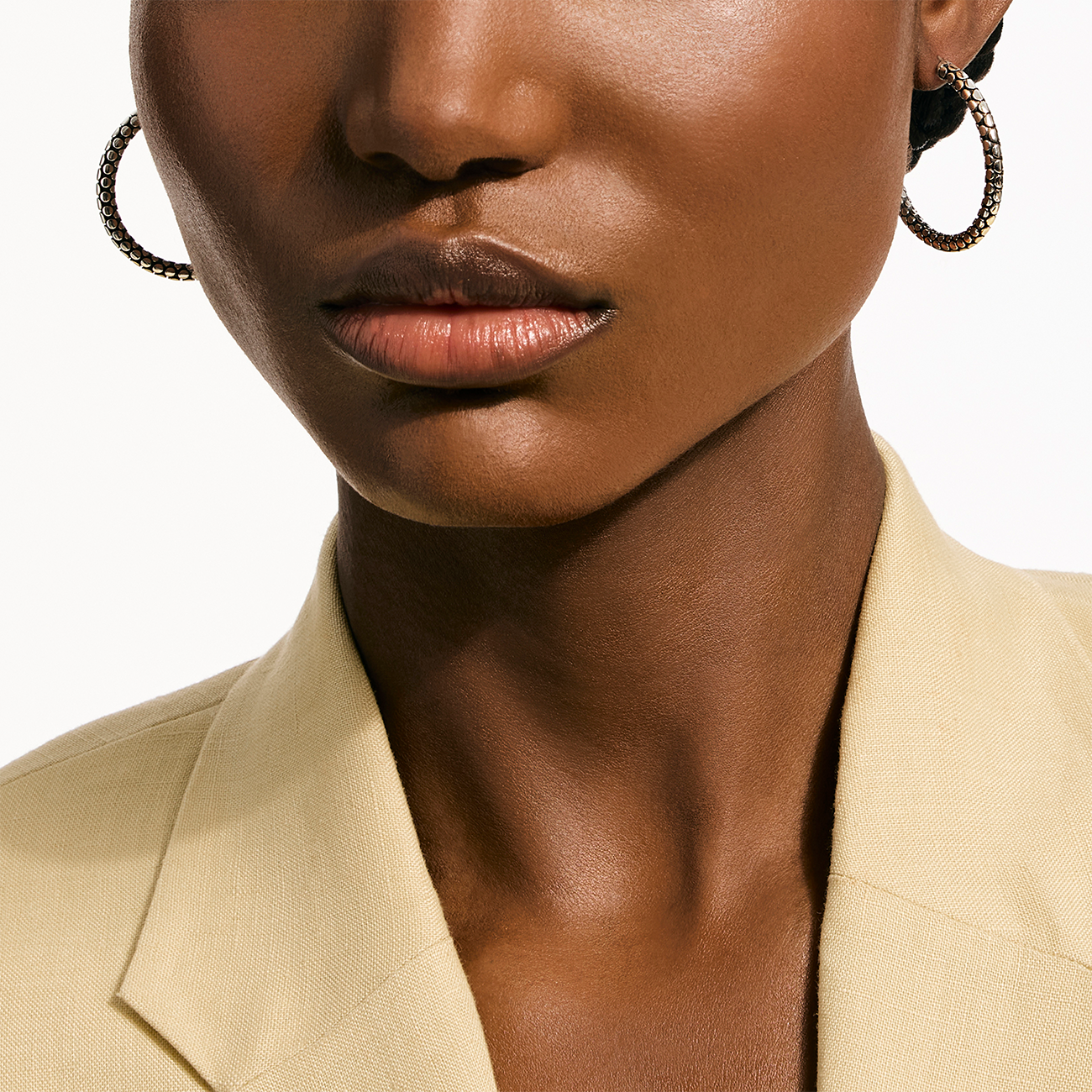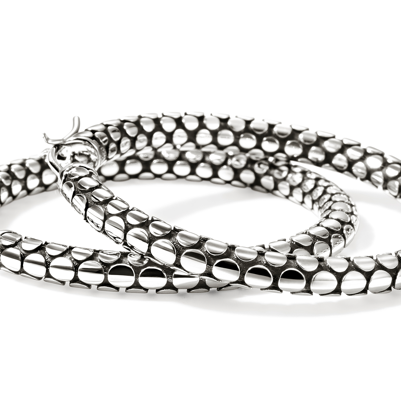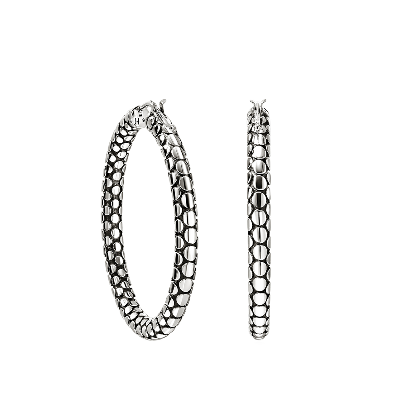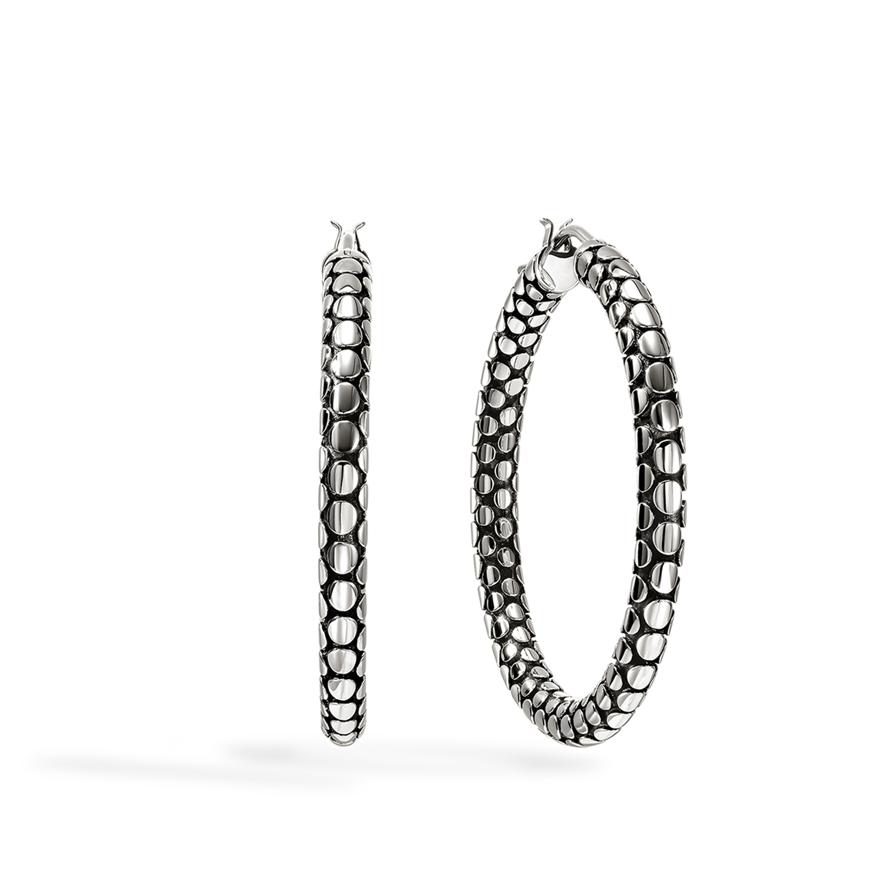 Made from sterling silver, these 37mm hoop earrings showcase John Hardy’s iconic Dot motif, which symbolizes connection and unity. Their polished finish and sculptural texture provide an elegant, artistic touch suitable for everyday wear.