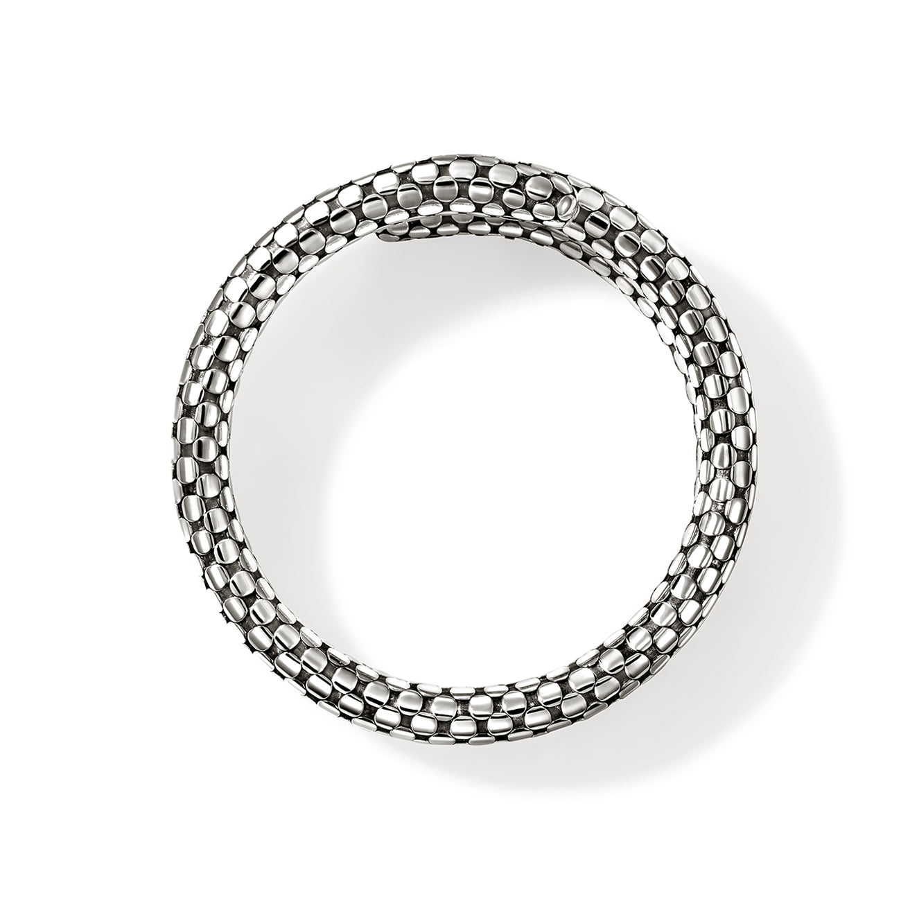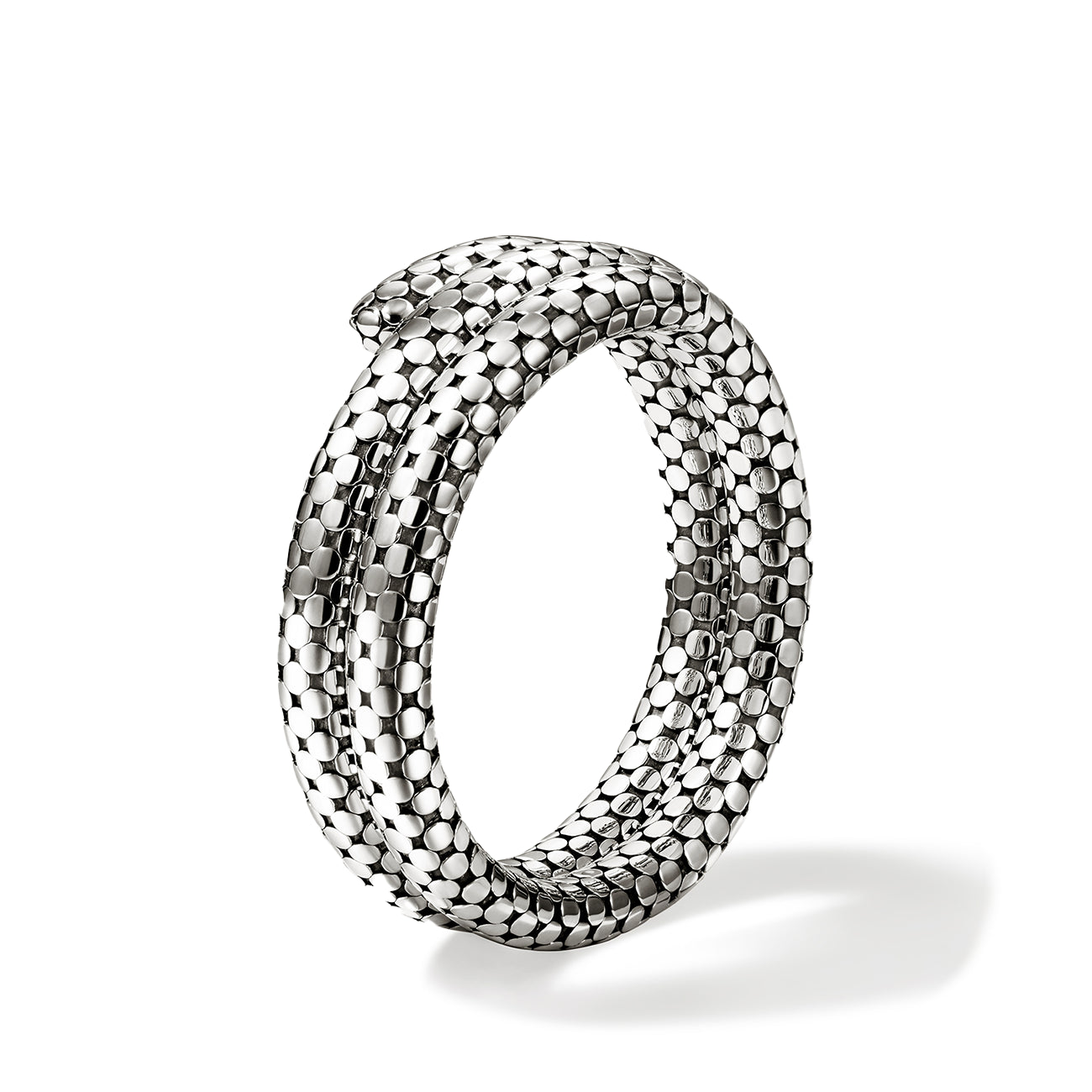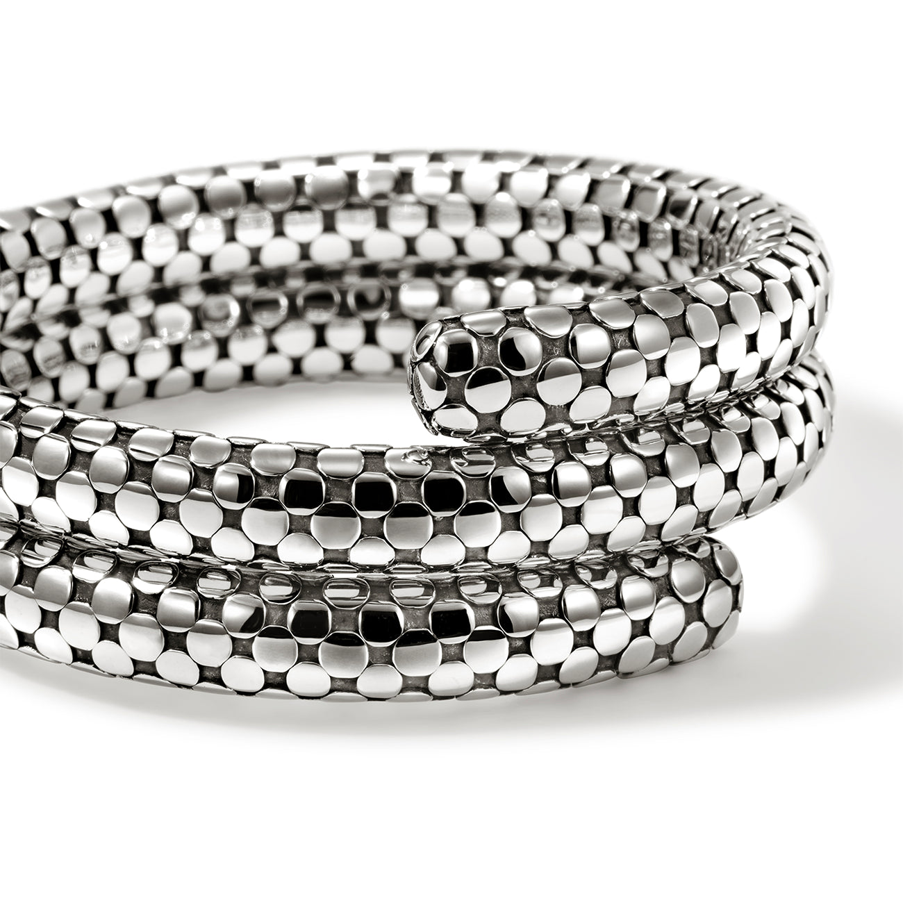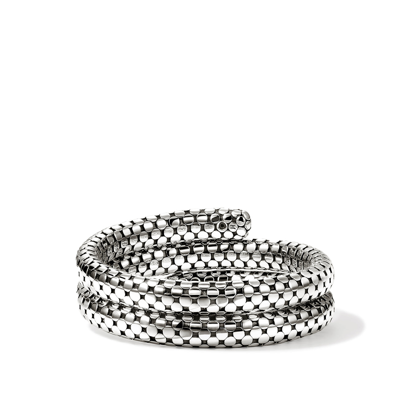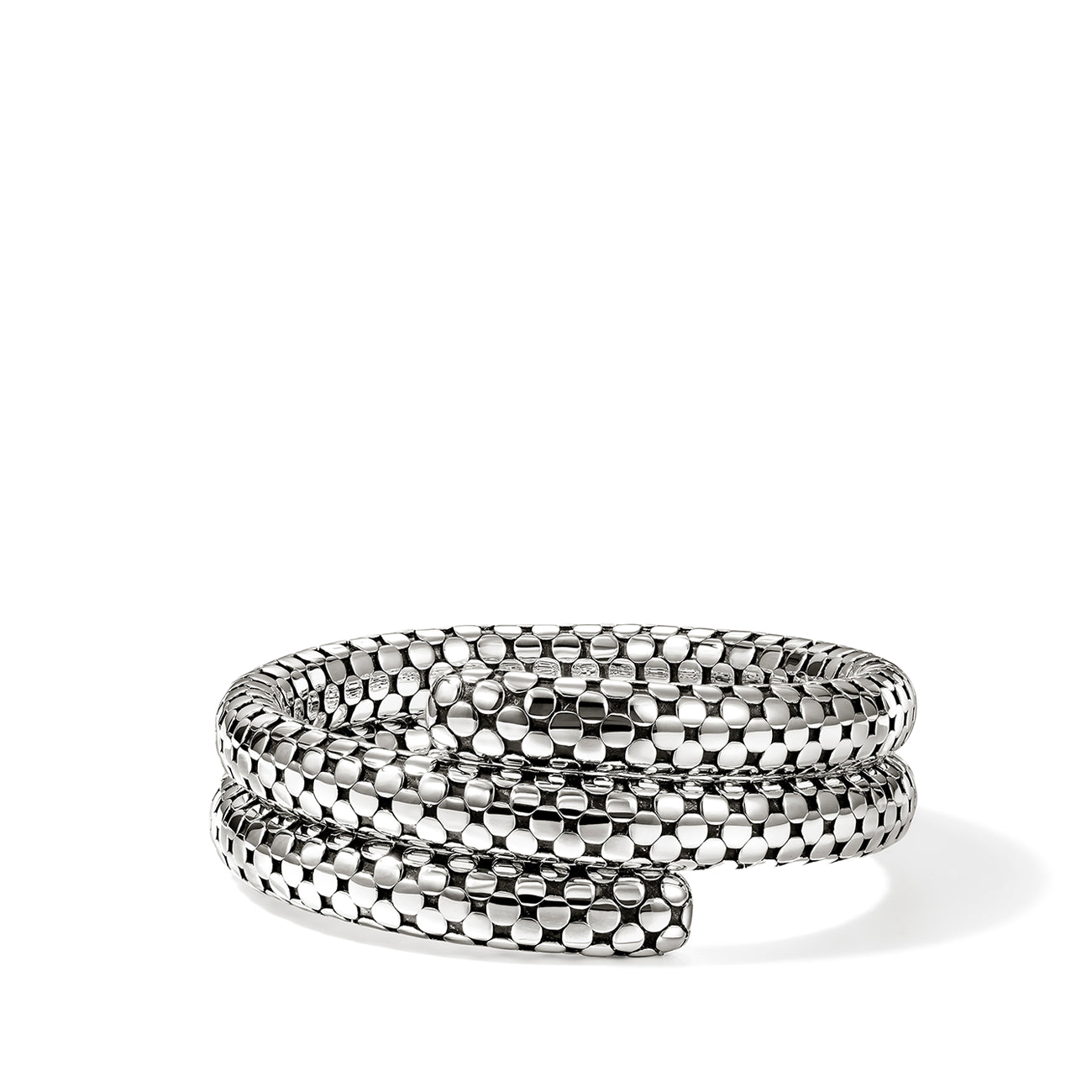 Bold and sculptural, this handcrafted silver bracelet wraps the wrist in two elegant coils. Featuring John Hardy’s signature dot or classic motif detailing, it offers a flexible, comfortable fit and a striking silhouette inspired by Balinese artistry.