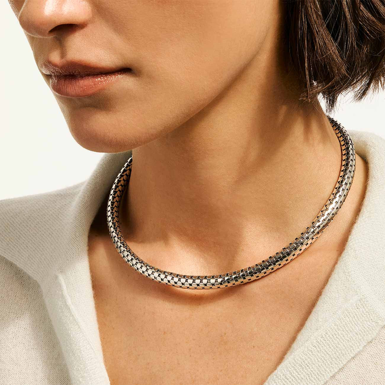 A handcrafted sterling silver necklace from the Dot Collection. Comprising symmetrical bead links, it forms an elegant collar that sits gracefully along the neckline. The signature dot motif represents harmony and infinite possibility, making this a polished, symbolic piece perfect for layering or standalone wear.