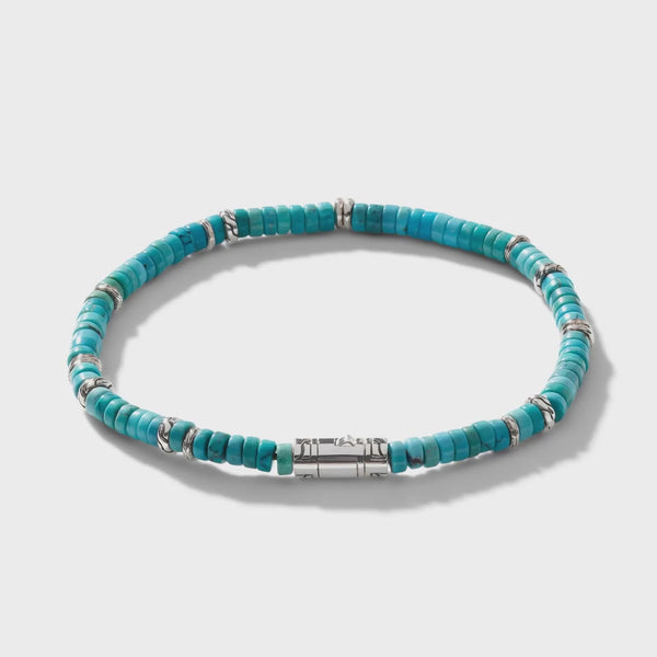 4mm turquoise bead bracelet with classic chain rondel. Classic chain pusher clasp keeps the bracelet secure to your wrist.