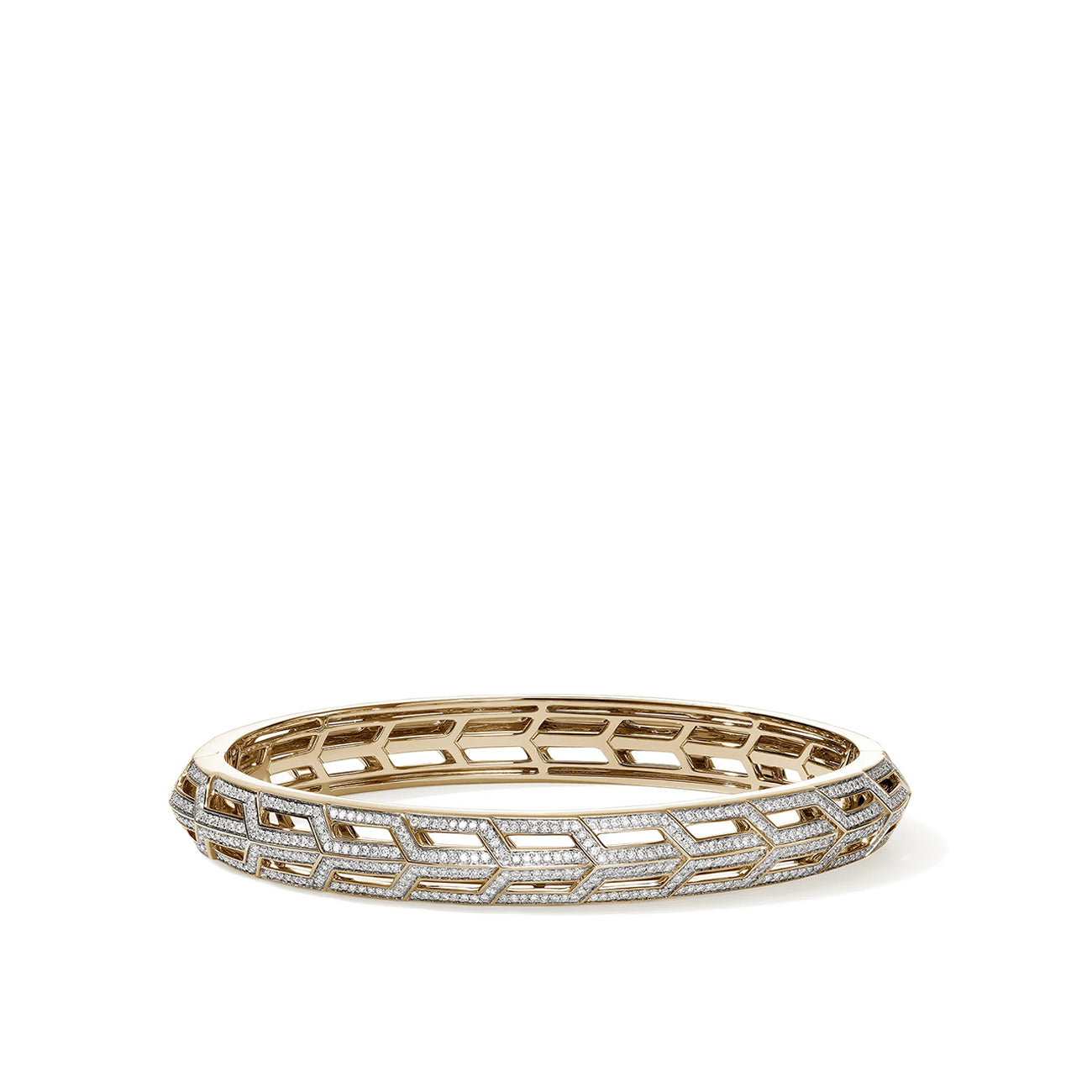 Crafted in 14k yellow gold, this oval hinged bangle showcases a refined geometric pattern accented with 1.75 carats of pavé-set diamonds. Measuring 9mm wide, the bracelet combines structure and sparkle with effortless wearability. Its hidden hinge design allows for a secure, comfortable fit, making it a versatile piece that transitions seamlessly from day to evening.