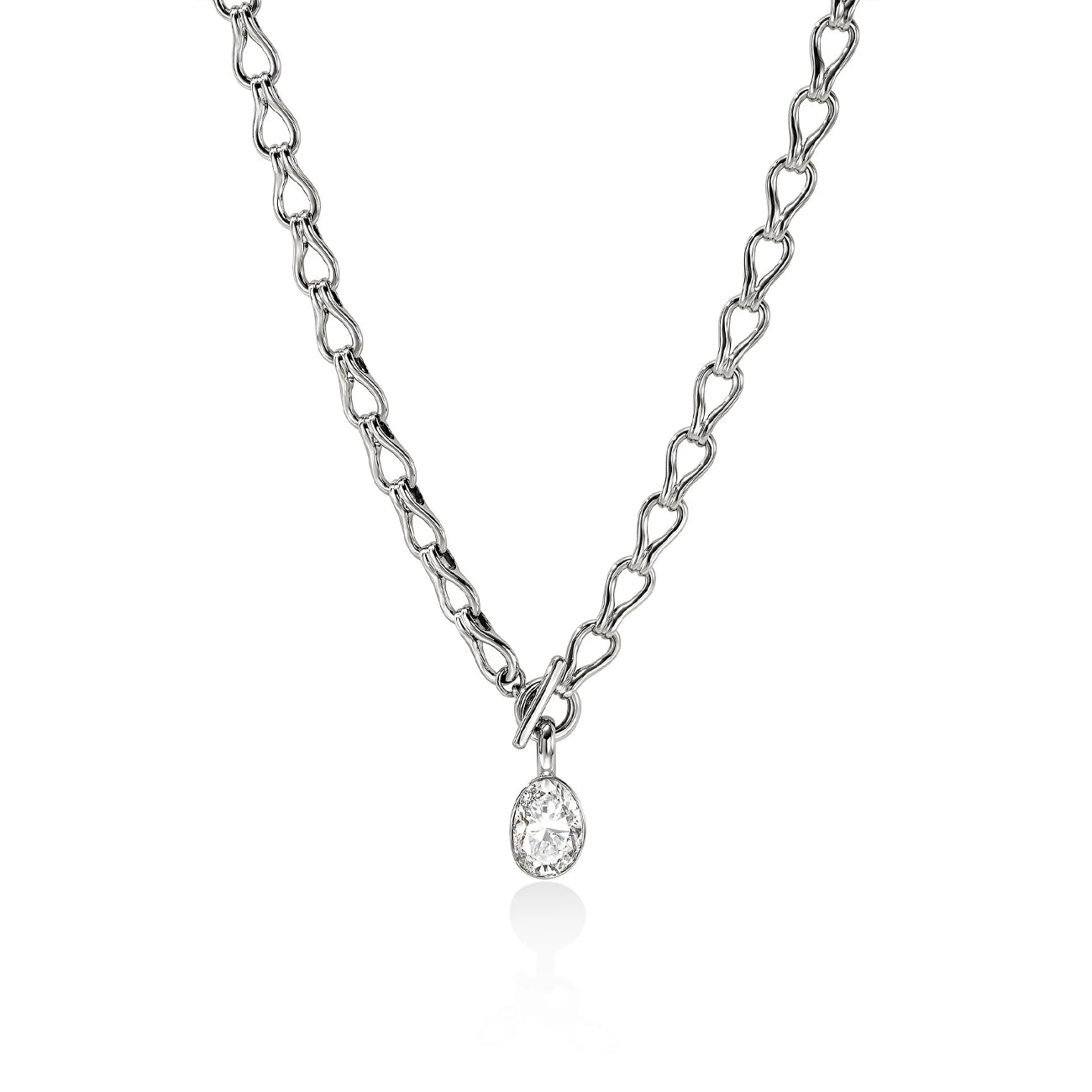 Bold texture meets refined brilliance in this sustainably crafted necklace, handcrafted in reclaimed sterling silver. A strand of substantial 5MM sculptural beads creates a confident silhouette, finished with a modern toggle clasp that adds both ease and visual interest. The centerpiece features a bezel-set lab-grown diamond in a distinctive freeform oval brilliant cut, measuring 17.65MM x 8.30MM. With an impressive 2.50 total carat weight, VS clarity, and G color, the diamond offers exceptional fire and luminosity while maintaining a clean, contemporary profile. The bezel setting enhances the stone’s organic shape and provides a smooth, sculptural finish. Designed to balance texture, scale, and responsible sourcing, this necklace makes a statement while remaining effortlessly wearable.