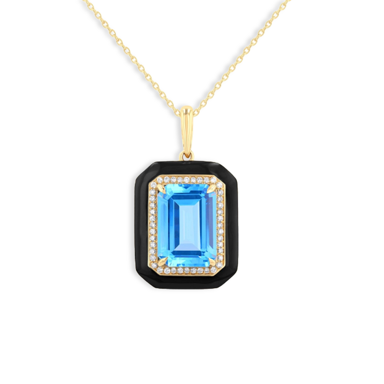 Behold the stunning emerald-cut blue topaz, flawlessly set in 14K white gold. This striking pendant necklace commands attention with its dazzling halo of round-cut diamonds and bold blue sapphires that elevate its design. With its vibrant color and exceptional sparkle, this piece will enhance any ensemble, making a statement wherever you go.