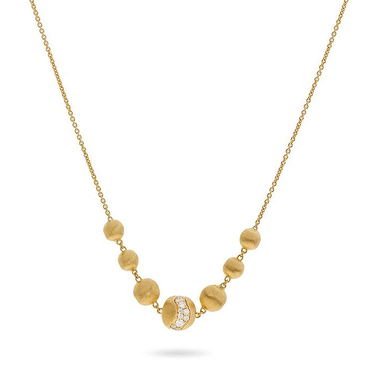 This short necklace from Marco Bicego's Africa Constellation collection has a brilliant sparkle! Crafted in 18K yellow gold, seven graduated hand-engraved 18K yellow gold boules, etched with the traditional Bulino tool that provides a finely brushed texture, hang on a 16.5" chain. The largest gold sphere at the center is embellished with an organically shaped diamond wave, set with multiple-sized diamonds. This Marco Bicego station necklace has a sophisticated style.
