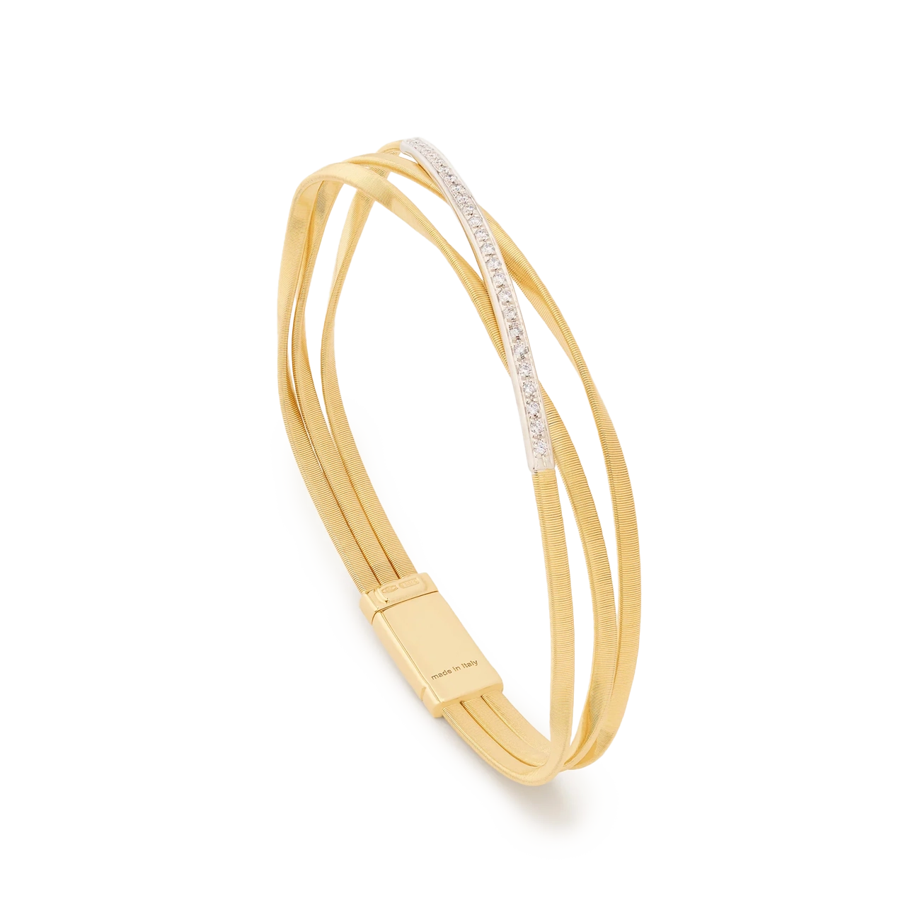 A semi-rigid three-strand twisted coil bracelet featuring a diamond bar accent. Crafted in 18K yellow and white gold using the brand’s signature coil technique, it is designed for easy layering within the collection.