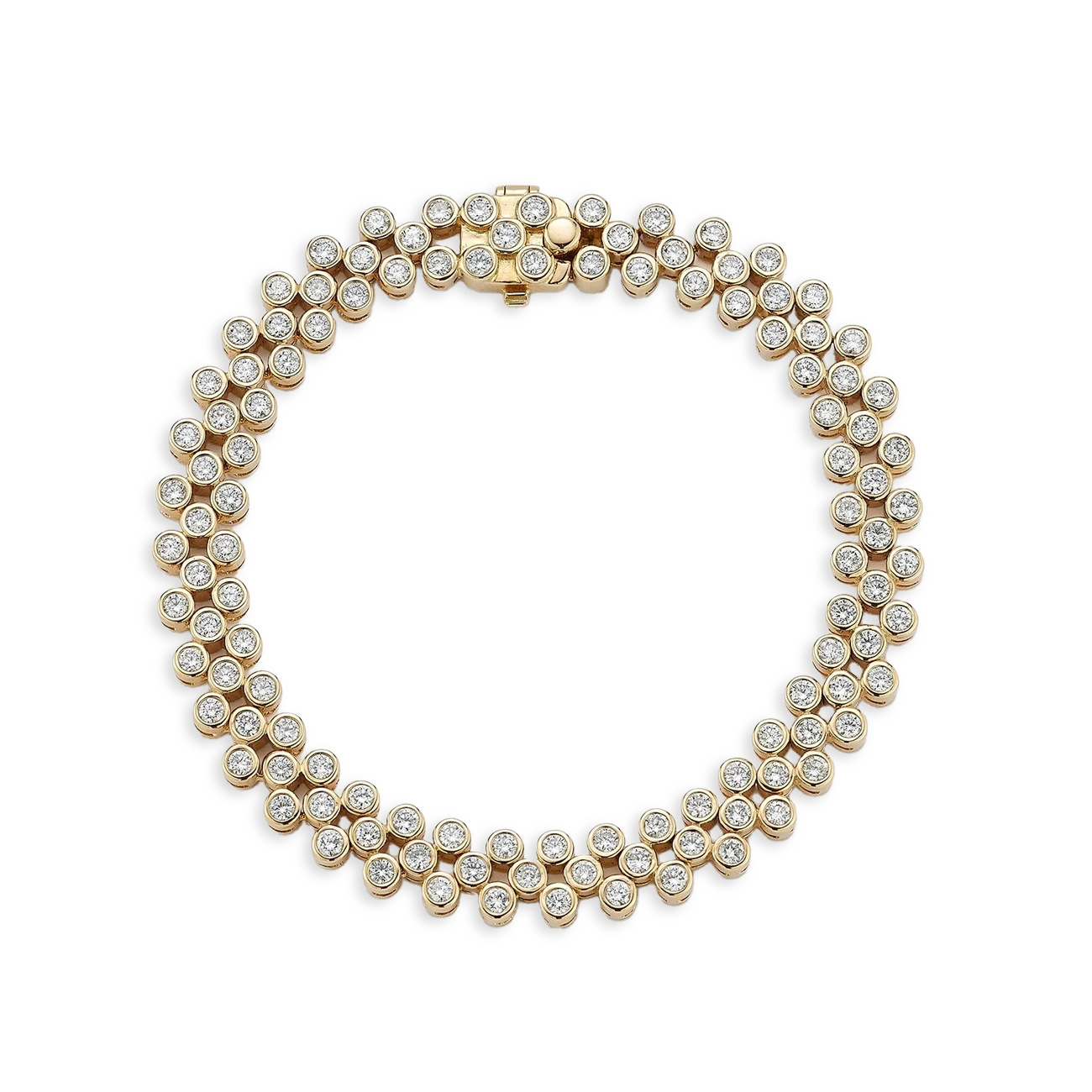A modern twist on the classic diamond tennis bracelet, the Chequer Tennis Bracelet showcases 3.67 carats of bezel-set diamonds arranged in an open checkered pattern that captures and reflects light with every movement. Its fully articulated design enhances fluidity and comfort, allowing each diamond to shimmer effortlessly across the wrist. Finished with a seamlessly integrated clasp, this striking bracelet embodies Ondyn’s signature fusion of innovation and elegance, making it a standout piece in any fine jewelry collection.