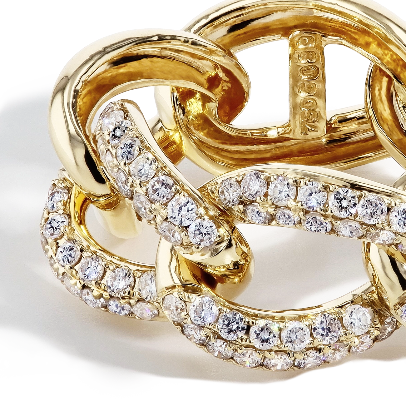 This bold and stylish 18K yellow gold ring features an interlocking link design, set with 1.20 carats of sparkling diamonds.Perfect for everyday luxury or as a unique addition to a ring stack, this design brings a modern edge to classic diamond jewelry.