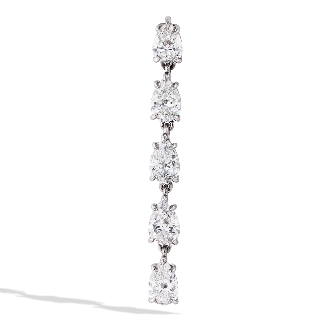 These elegant drop earrings are crafted in platinum and feature ten pear-shaped diamonds totaling 7.21 carats. Each diamond is gracefully linked in a linear design, creating exceptional movement. Finished with secure posts and oversized backs for comfortable wear.