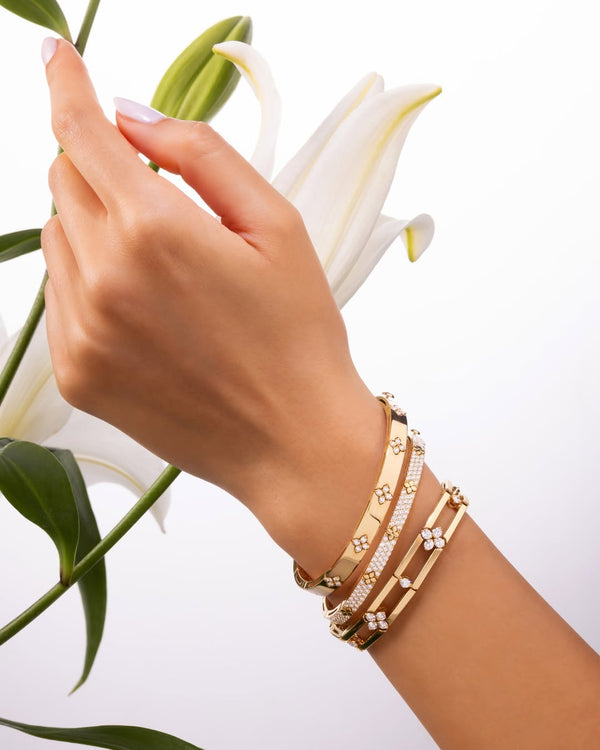 18K yellow gold bangle bracelet with round brilliant cut diamonds weighing 1.75ctw set in a floral pattern from Roberto Coin. This bracelet is 8.5mm wide and is a hinged bangle with a pressure tongue and groove clasp.