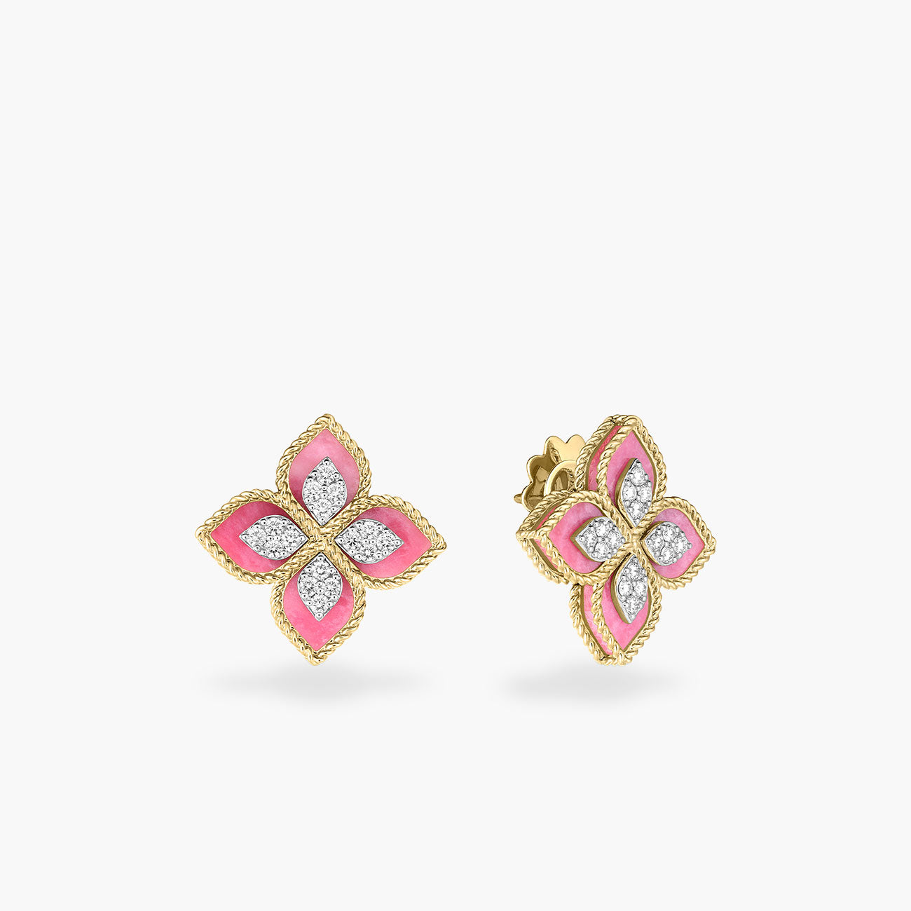 Discover the allure of Roberto Coin's craftsmanship and design embodied in these stunning stud earrings. Adorn yourself with timeless elegance using the Roberto Coin Princess Flower Diamond Flower Stud Earrings. These earrings feature 18K Yellow gold flowers embellished with sparkling diamonds and a signature Roberto Coin ruby set in the back of one of the flower studs. Perfect for any occasion and goes well with any ensemble.