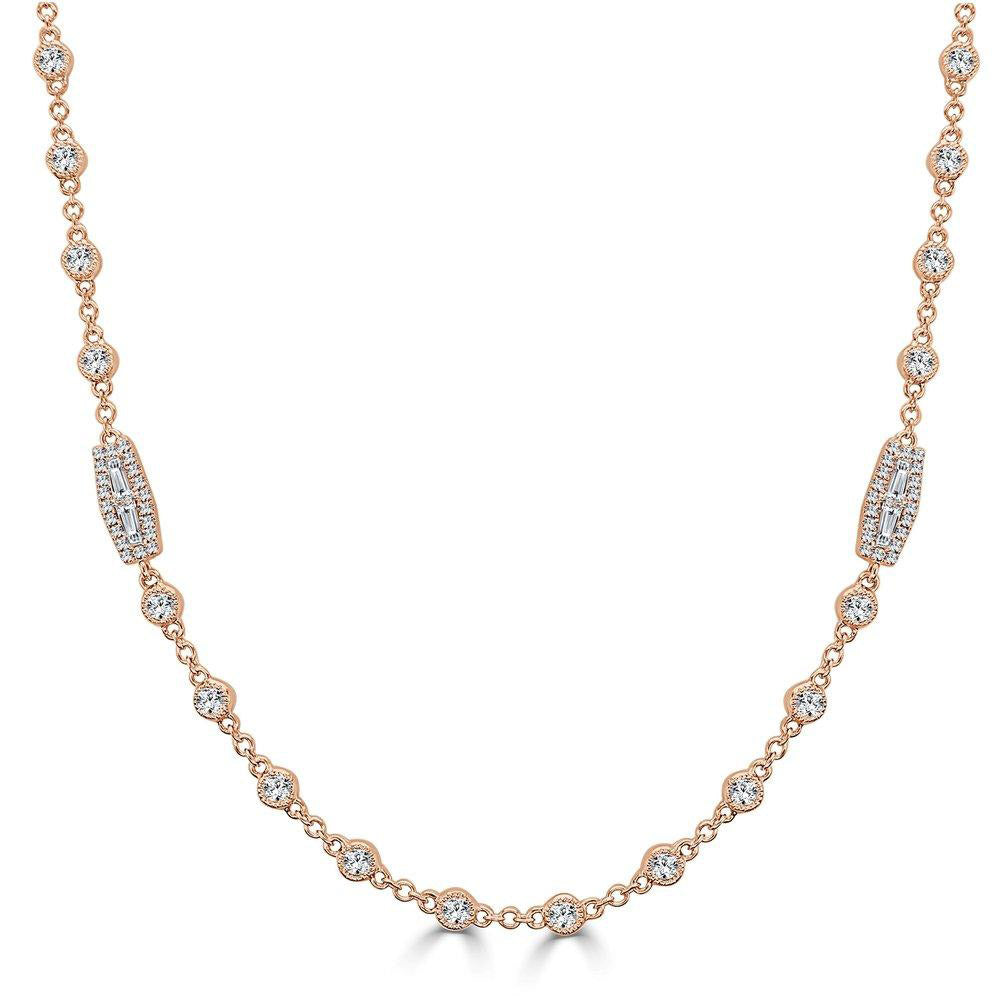 Round and Baguette Diamond Station Necklace in Rose Gold
