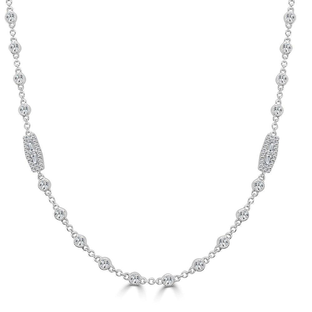 This 32" necklace is crafted in your choice of 18k gold and features round and baguette cut diamonds stationed to the chain.