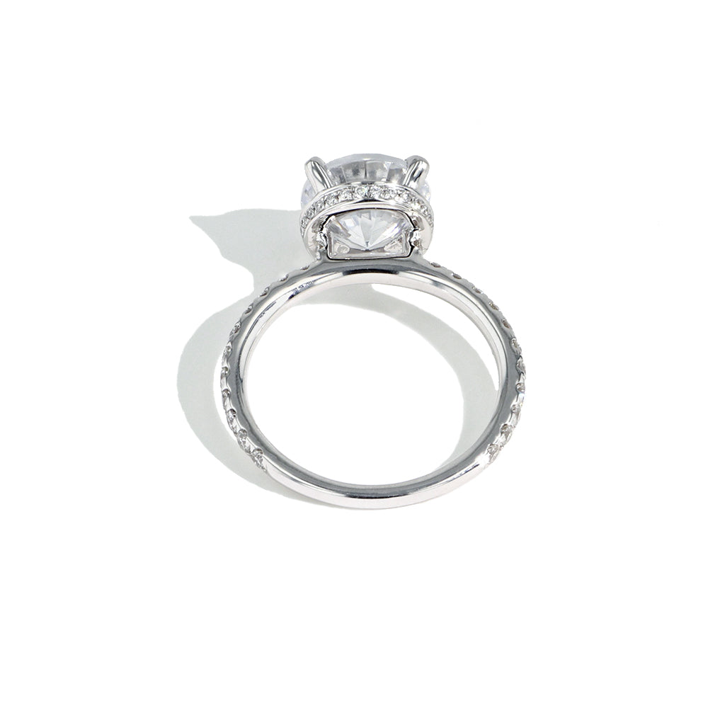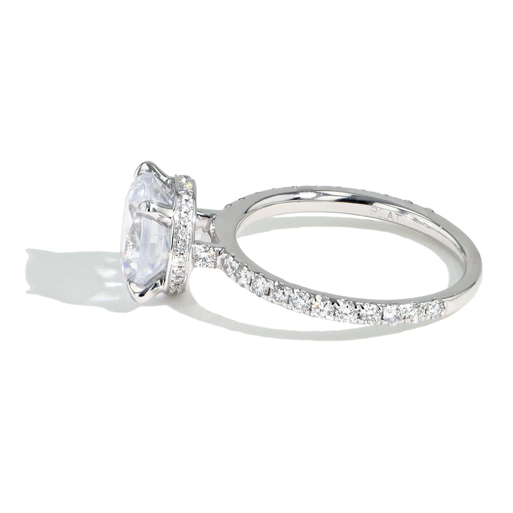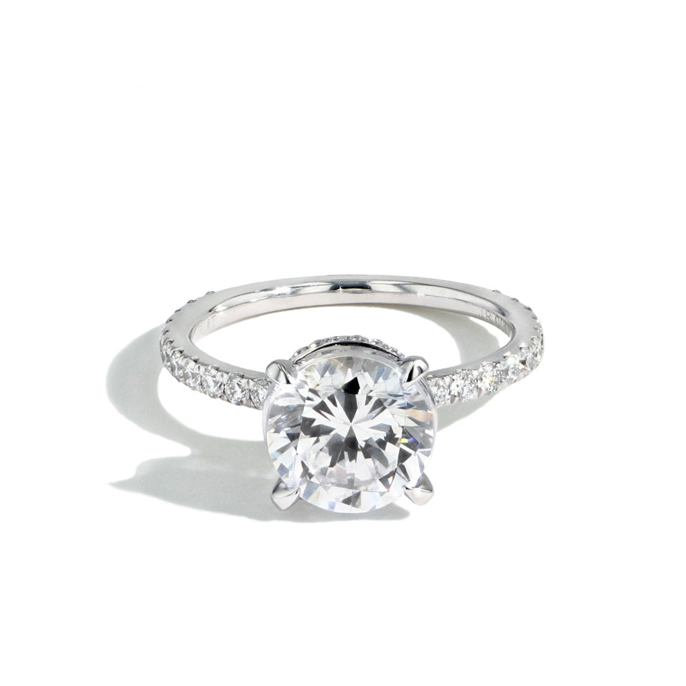 A classic hidden halo engagement ring setting for a round center diamond. Showcases .50ctw of pave diamonds going 3/4 of the way around the dainty platinum band.