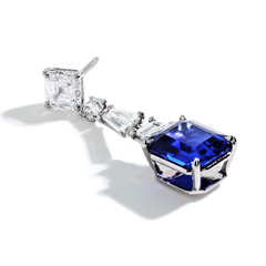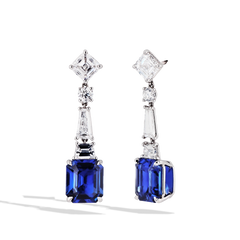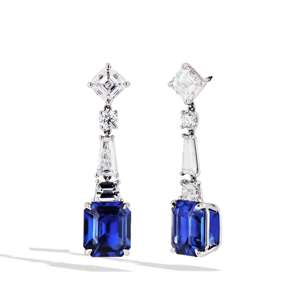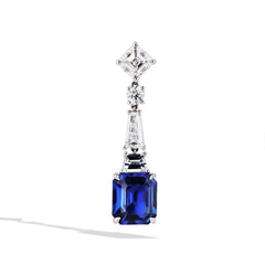 These exquisite platinum dangle earrings showcase two captivating emerald-cut blue sapphires totaling 11.77 carats, radiating a rich, velvety hue. Each sapphire is elegantly framed by tapered baguette and trapezoid-cut diamonds, arranged in a geometric composition that enhances the sapphires’ brilliance