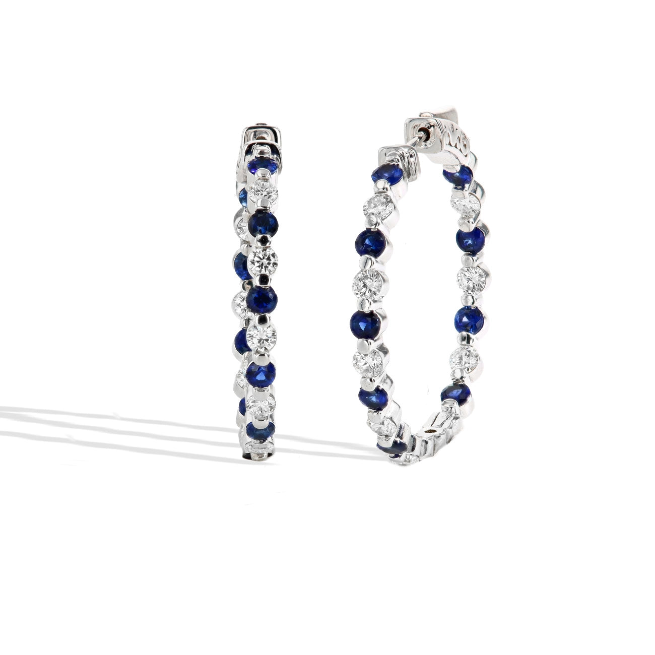 These earrings showcase an alternating pattern of blue sapphires and diamonds in an elegant in-and-out design, ensuring the stones are visible from every angle. Crafted in 18k white gold, this is a striking statement piece.