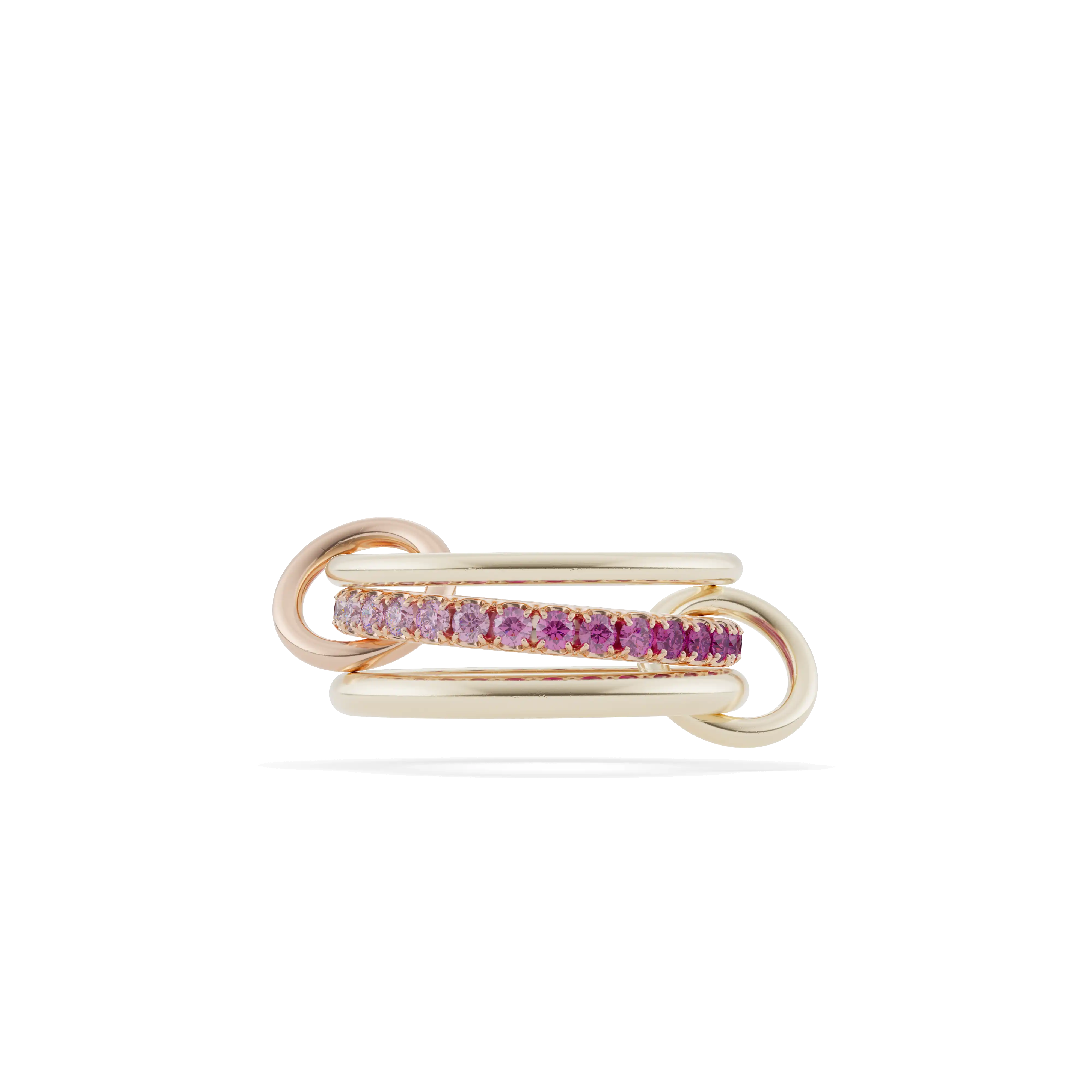 The Petunia Ring features a central band of pink sapphire ombré gemstones (approx. 1.40 cttw) that transition from rich deep pink to light pink, framed by two sleek bands of 18k yellow gold. Connected by smooth, orbiting links, this sculptural design offers fluid movement and a contemporary silhouette, perfect for effortless, everyday wear.