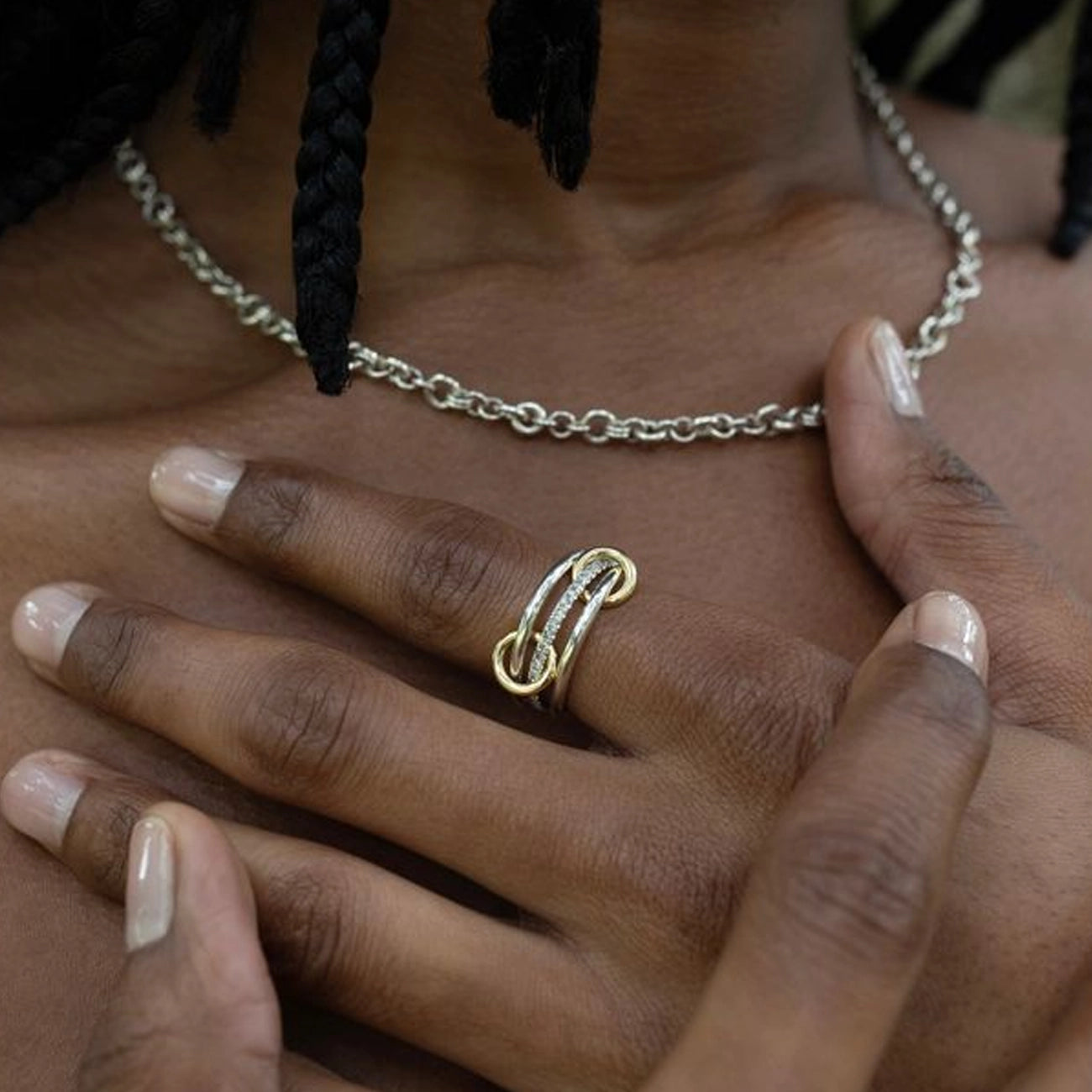 Three interlinked sterling silver bands come together in a sleek, architectural design accented by a pavé grey diamonds. The warm yellow gold connectors add contrast and sophistication, creating a piece that embodies modern luxury. Elegant yet bold, the Sonny Gris ring captures understated brilliance with a contemporary edge.