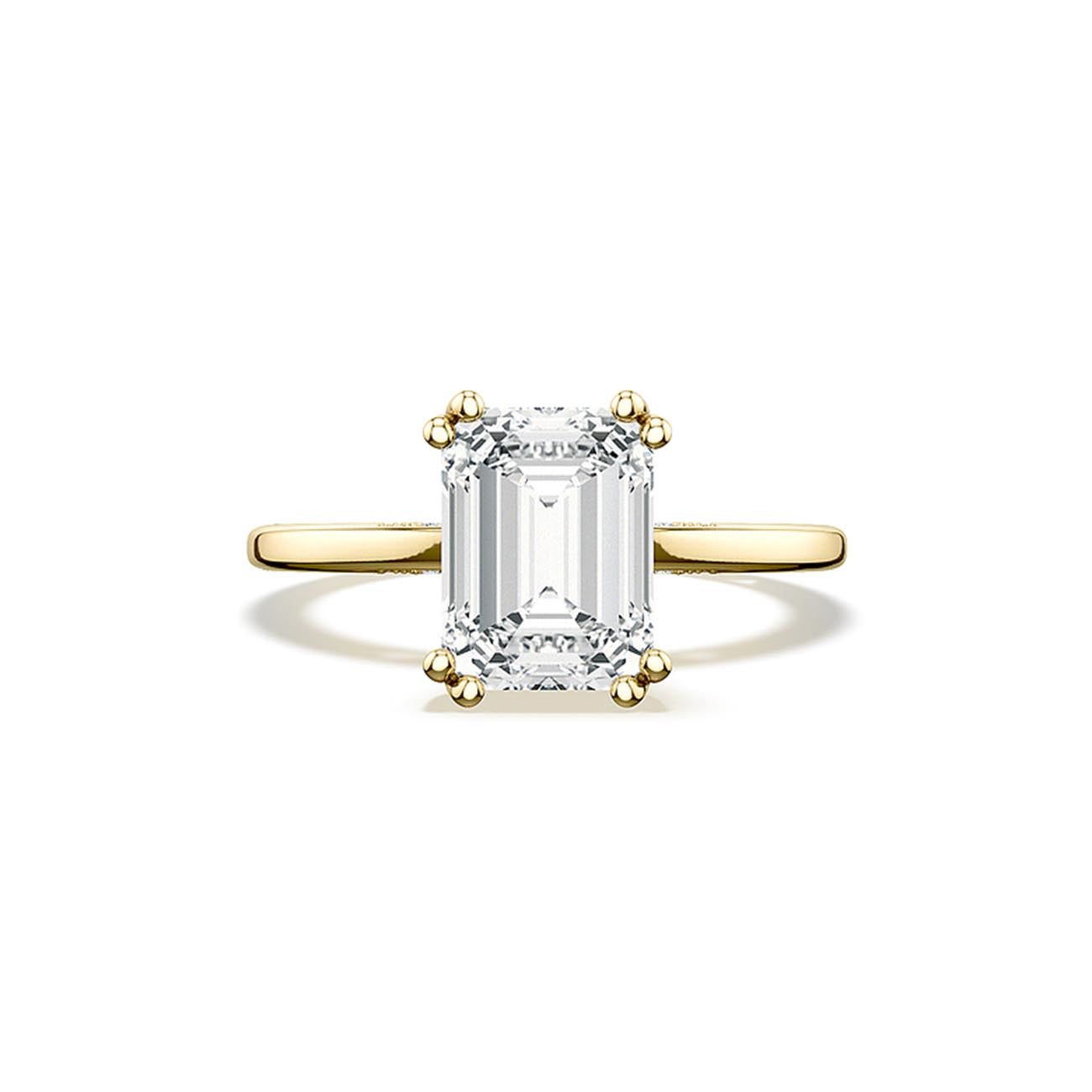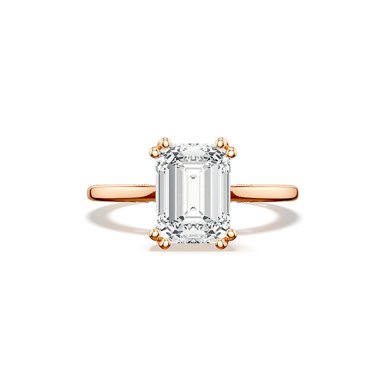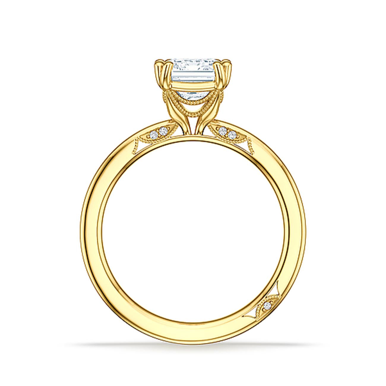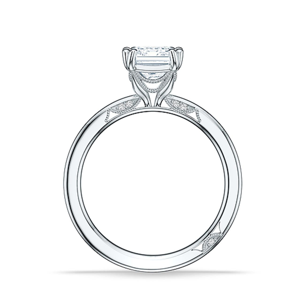 Simply Tacori provides a perfect setting for your dazzling Emerald Cut Diamond. Its simple and sleek design doe's not take away from the center stone. The ring is available in your choice of 18K gold or Platinum. Center stone not included.