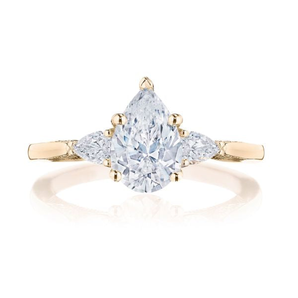 A beautiful engagement ring setting from the Simply Tacori collection showcasing pear side stones on either side. The setting fits a pear center diamond and is set in 18K gold or platinum.