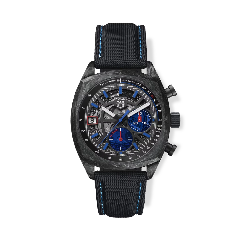 Monza returns in a contemporary tribute to the indelible link between TAG Heuer and competition motorsport: this striking carbon rendition with an extreme sports look embodies the very essence of the Maison. The 42-mm case, made of ultra-lightweight and resistant carbon, is powered by the Manufacture Calibre TH20-12 Flyback, a chronograph movement with COSC certification. A watchmaking statement.