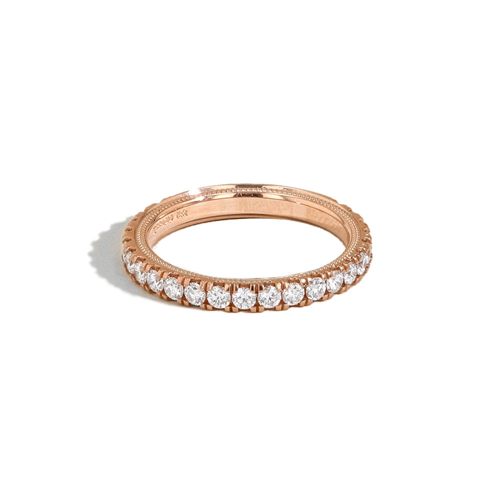 This Tradition collection 14K rose gold diamond wedding band showcases .83ctw of brilliant white diamonds and French bead detailing on the profile.