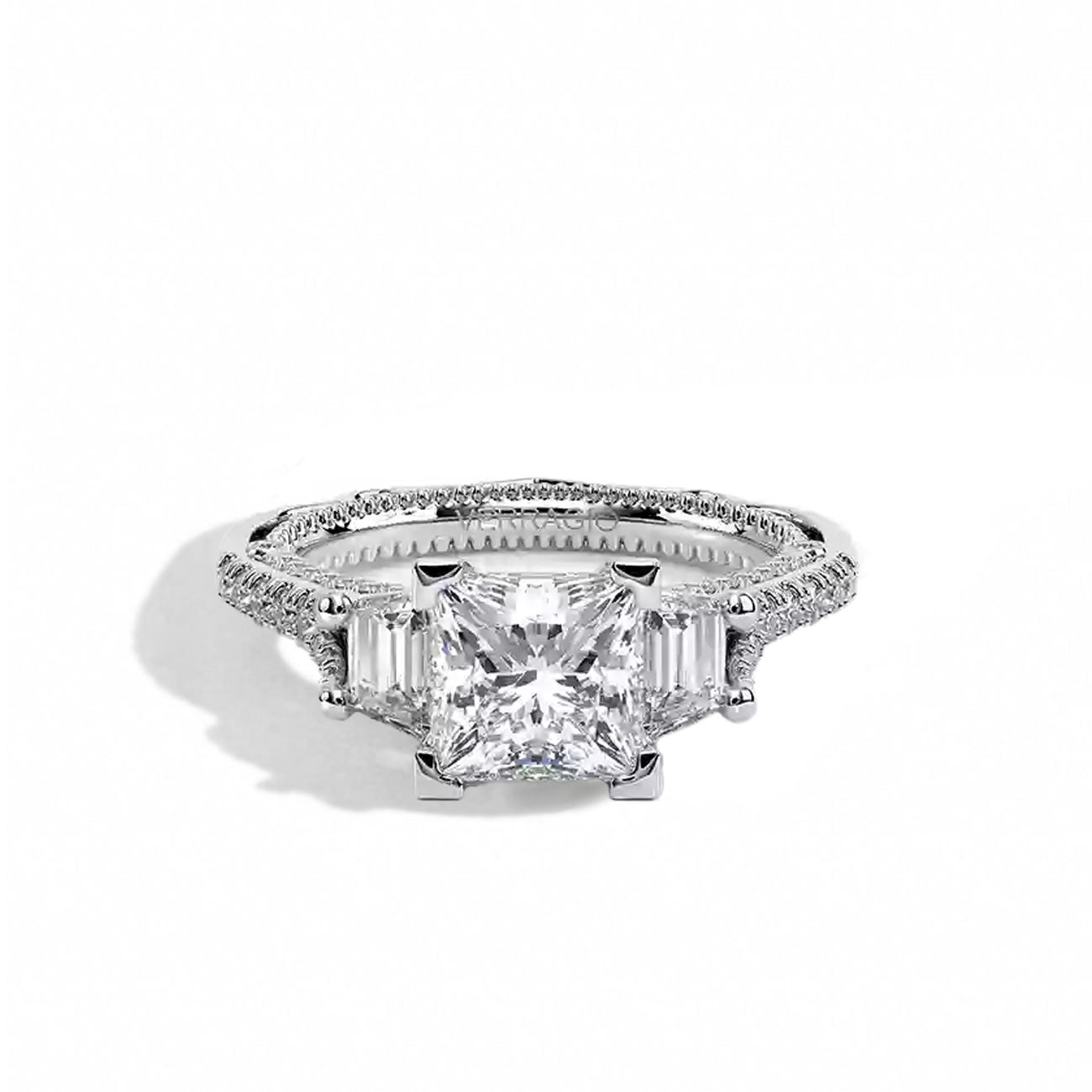 Inspired by retro glamour, this vintage engagement ring setting features two trapezoid-cut side diamonds set into the 18k white gold, diamond band. The intricate inner-profile is set with a half-diamond Riviera embellished with lace details, complete with Verragio's signature beading and crest. The timeless beauty and exquisite craftsmanship make this a cherished heirloom for generations to come.