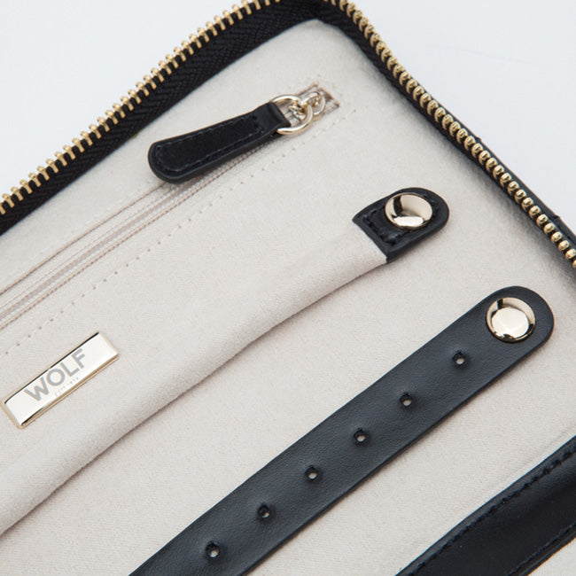 This quilted black leather jewelry portfolio from the Wolf Caroline collection is a classic case that will never go out of style. It features 13 earrings holes, a ring roll, two compartments and four necklace holders with pocket. Gold hardware and accents, along with a tassel, finish the exterior elegantly, while the interior is lined with an anti-tarnish fabric. The piece closes with a zip lock. Store your valuables stylishly with this jewelry portfolio case from Wolf!