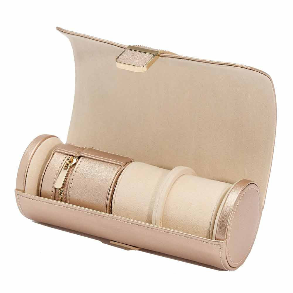 This beautiful rose gold Palermo double watch roll is perfect for traveling. This roll is perfect for two watches up to 42mm and includes a pouch for other jewelry. LusterLoc™: Allows the fabric lining the inside of your jewellery cases to absorb the hostile gases known to cause tarnishing.